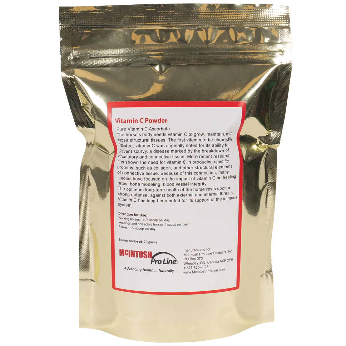 There’s nothing like McIntosh Pro Line Vitamin C Powder to provide your horse’s body with the antioxidant and immune support it needs to help stay healthy. Non-Acidic and gentle on the stomach, McIntosh Pro Line Vitamin C Powder is Ascorbate C which means, unlike Vitamin C Ascorbic, McIntosh Pro Line Vitamin C is not acidic and will not irritate or upset the stomach. Also helps to maintain muscle function and support bones, cartilage, teeth, gums, and healthy skin.