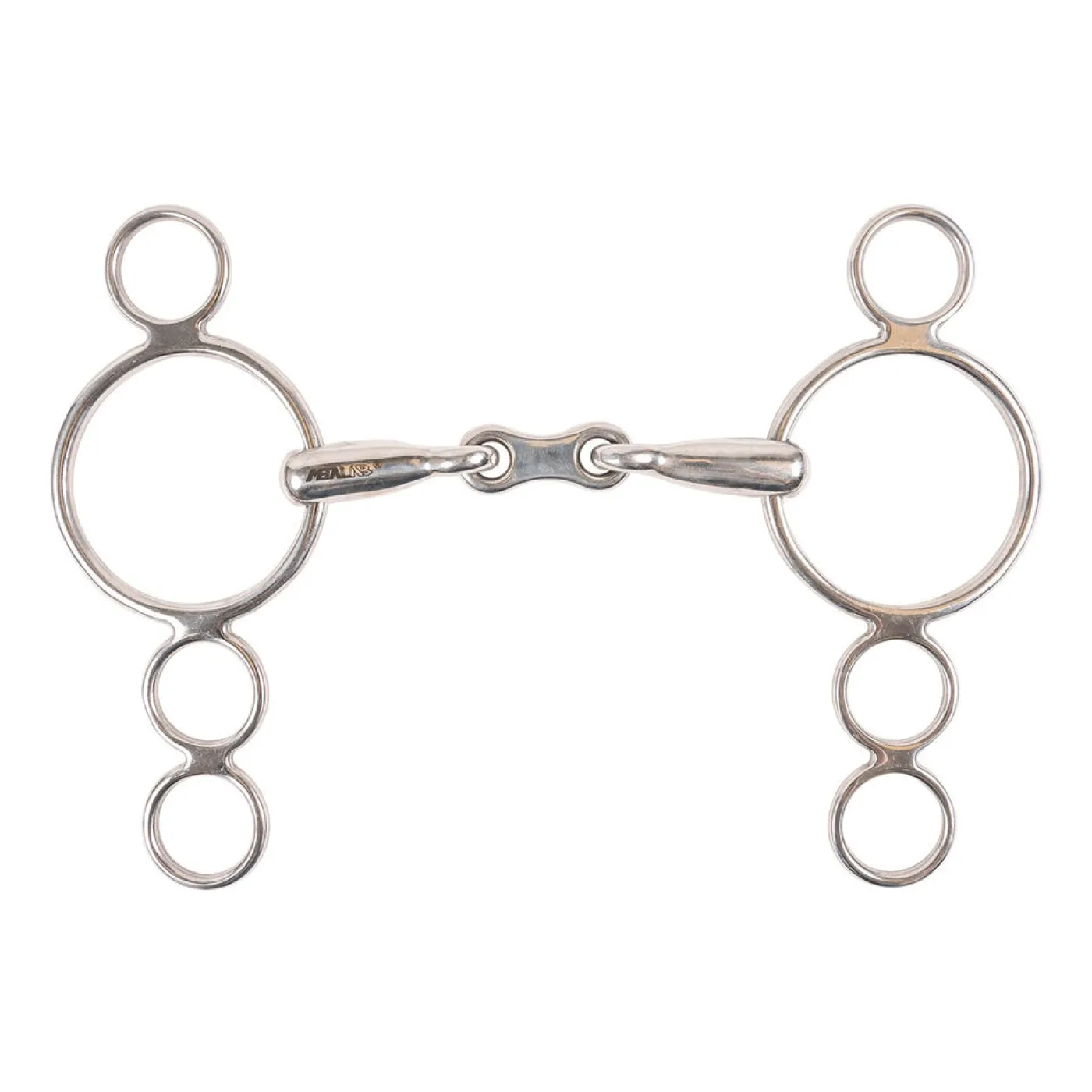 Crafted in stainless steel, the Metalab Loose Ring French Link Elevator Bit features three-ring elevator cheeks to offer a variety of rein placement options depending on the amount of leverage required. The double-jointed French link mouthpiece features a short middle link to help reduce pressure on the roof of the mouth and can help to lessen the ‘nutcracker’ effect on the lower jaw.
