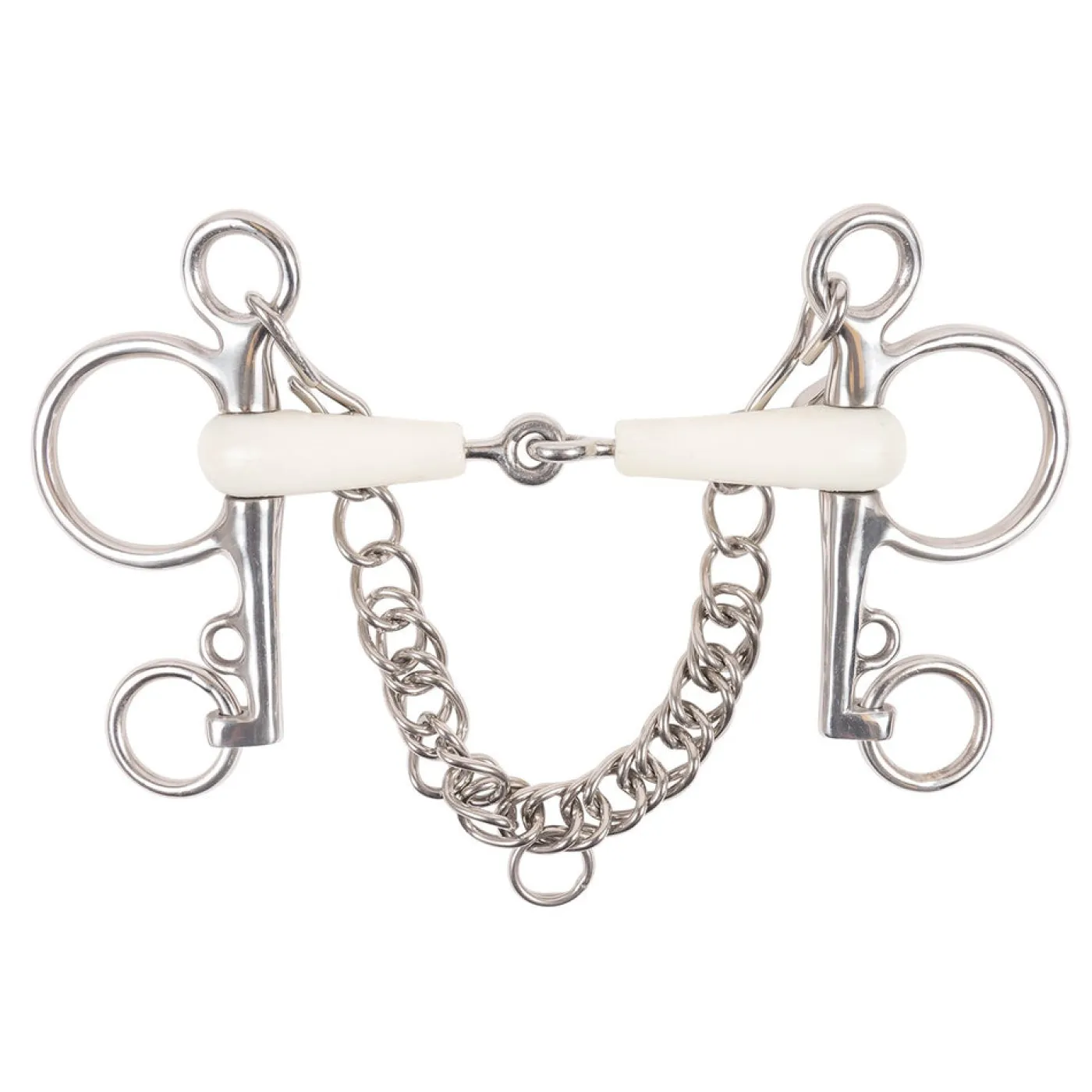The Metalab Snaffle Mouth Flexi Pelham Bit is designed to combine the effects of a snaffle and curb and help encourage the horse to bend at the poll through pressure applied by the curb rein. Crafted from a premium quality stainless steel for optimal durability and featuring a softer, flexi plastic on the mouthpiece for enhanced comfort. Single-jointed snaffle mouthpiece and complete with a curb chain.