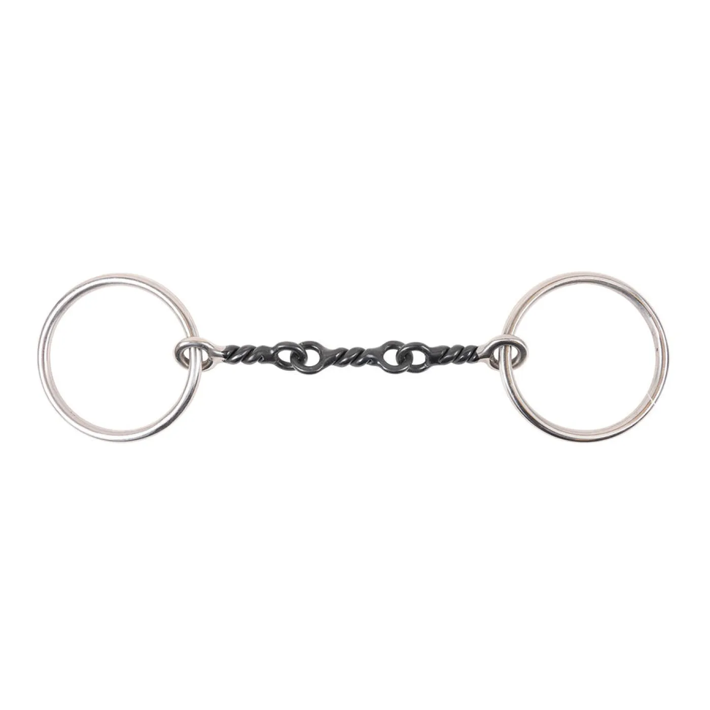 The Metalab Sweet Iron Loose Ring Chain Link Snaffle Bit features a double jointed mouthpiece made from sweet iron. The mouthpiece is made of three twisted wires with sweet iron sections to soften the mouth and allow some tongue relief. Sweet iron encourages salivation as it oxidizes over time. Stainless steel loose ring cheeks. Direct action bit without leverage.