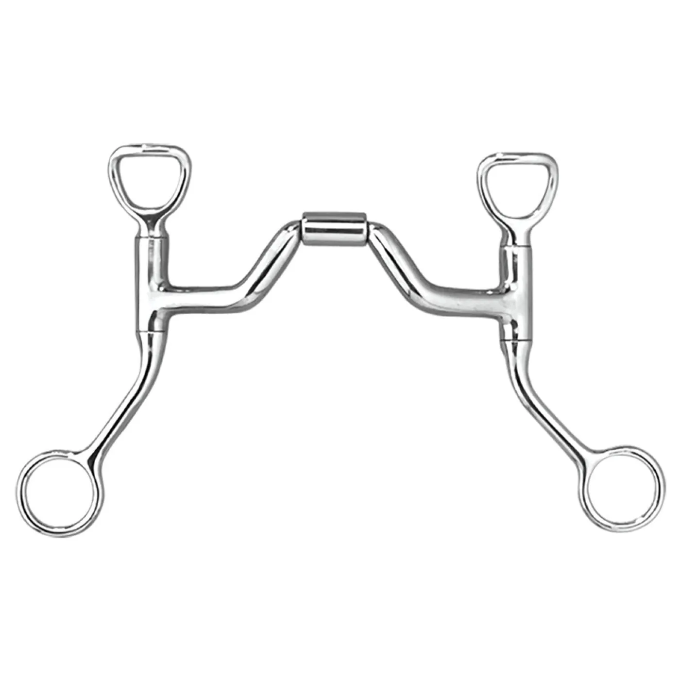 The Myler HBT Shank Bit W/ Ported Barrel features the MB 33 sweet iron mouthpiece, which oxidizes and encourages salivation. The MB 33 is the mildest Myler mouthpiece in terms of tongue pressure since the wide port allows room for the tongue to pass almost completely under the bit. Because this mouthpiece does not rotate onto the tongue and the port is wide, it applies little to no tongue pressure, working primarily off the lips and bars. The port on this mouthpiece is only 1 ½” high, so it will apply little to no palate pressure. Because the MB 33 offers such a high degree of tongue relief, the horse that goes well in this mouthpiece has a trustworthy and consistent disposition and is trained to work off the leg and seat as well as the hands. The HBT shank has the patented Independent Swivel Cheek, where the purchase, mouthpiece, and shank all move independently of each other. The purchase is slightly angled away from the cheek to avoid rubbing. It has an indirect (curb) rein action designed to be used with a curb strap that attaches to the purchase. The HBT shank uses the combination of the fixed cheek and fixed rein to apply pressure to the mouth, chin, and poll.