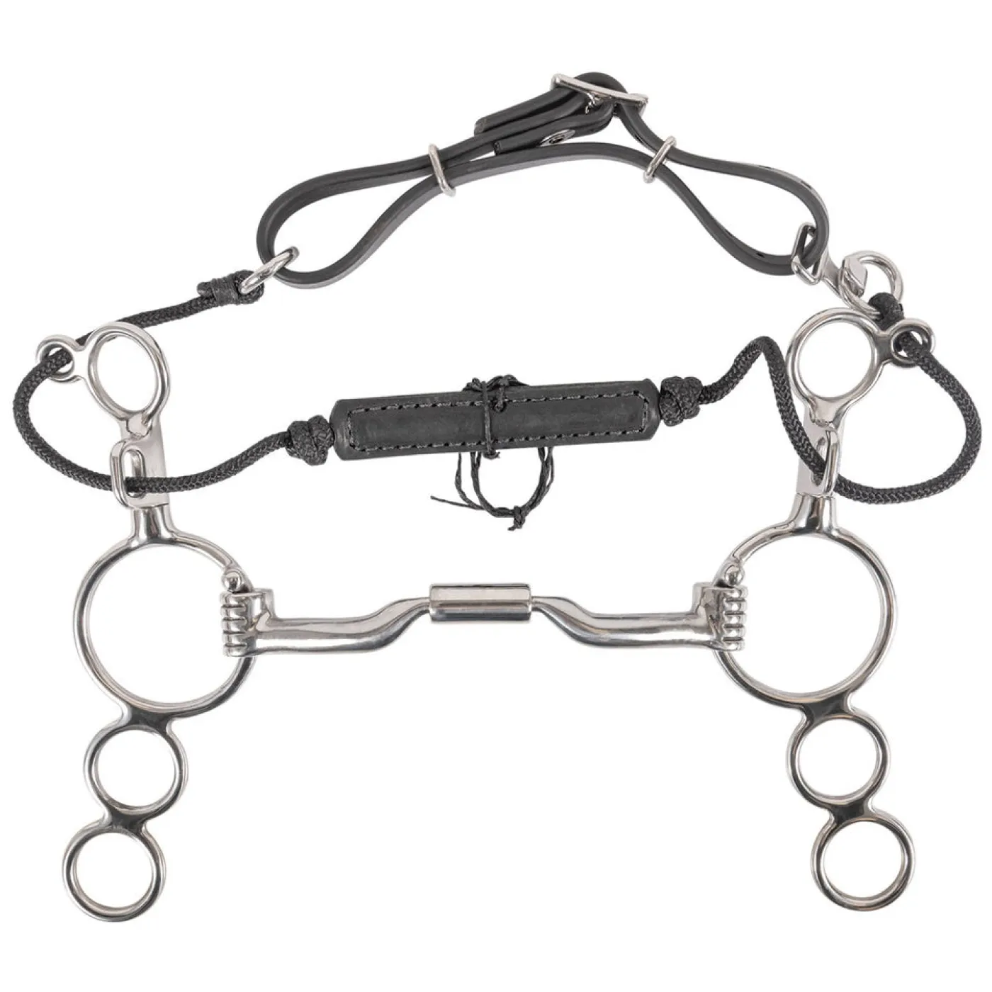 Crafted from durable stainless steel and featuring a sweet iron mouthpiece to help encourage salivation, the Myler Three Ring Combo Bit W/ Low Port is a unique combination of a ring bit, shank bit, and hackamore. Utilizing five different pressure points to help disperse rein pressure, the three-ring cheeks provide a choice of location for rein placement to help offer increased leverage. This bit features the MB 04 mouthpiece. The MB 04 is similar to the MB 02 in that it will rotate on the tongue and apply tongue pressure however, it has a small (¼”) port that introduces some tongue relief to the horse. The port allows the horse to swallow and move his tongue when he is moving forward and relaxed which acts as a release or reward. The mouthpiece is curved and it wraps around the bars and lips instead of pinching. Complete with a flat leather noseband, knotted cord sides, and a durable chin strap to help provide an optimal fit.