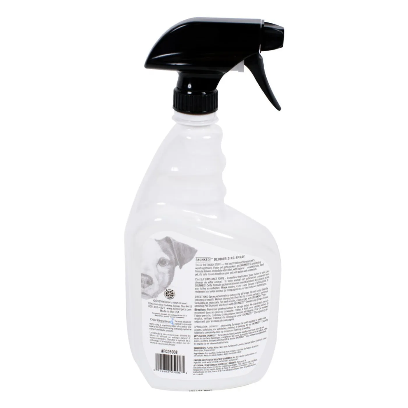 If your pet gets skunked, get rid of pesky odours with NILodor Tough Stuff Skunked Deodorizing Spray! The proprietary formula removes strong odours caused by skunks using a combination of powerful essential oils. Fast acting to provide immediate relief. This handy spray is safe to use directly on your pet and on water-safe materials. Use on carpets, upholstery, car interiors, clothing and bedding too! To use, spray liberally across your pet’s entire coat. Work in thoroughly and let dry. If odour persists, reapply as neccesary. For best results, combine with NILodour Tough Stuff Skunked Pet Shampoo or with NILodour Tough Stuff Skunked Laundry Additive. Complete with a light, fresh scent. Made in the USA. 32 oz.