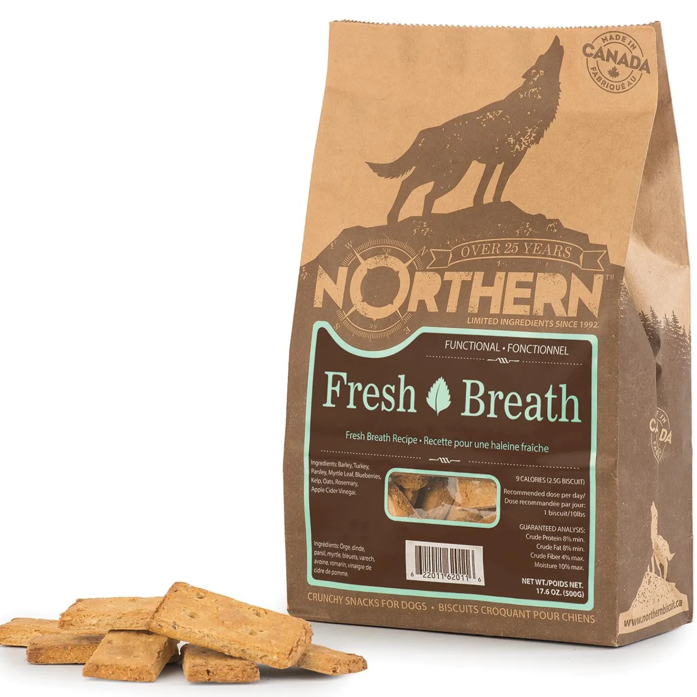 Constructed with limited ingredients, Fresh Breath biscuits work to improve dental health and oral hygiene! This refreshing recipe contains parsley, a known natural breath freshener and myrtle leaf to prevent the growth of bacteria. Atlantic Kelp is also combined to detoxify impurities, resulting in fresh breath. Slowly baked with whole barley and rolled oats, these biscuits are sure to satisfy your canine’s taste buds while also improving their health. Packaged in a 100% compostable bag. Made in Canada with fresh, locally sourced ingredients.