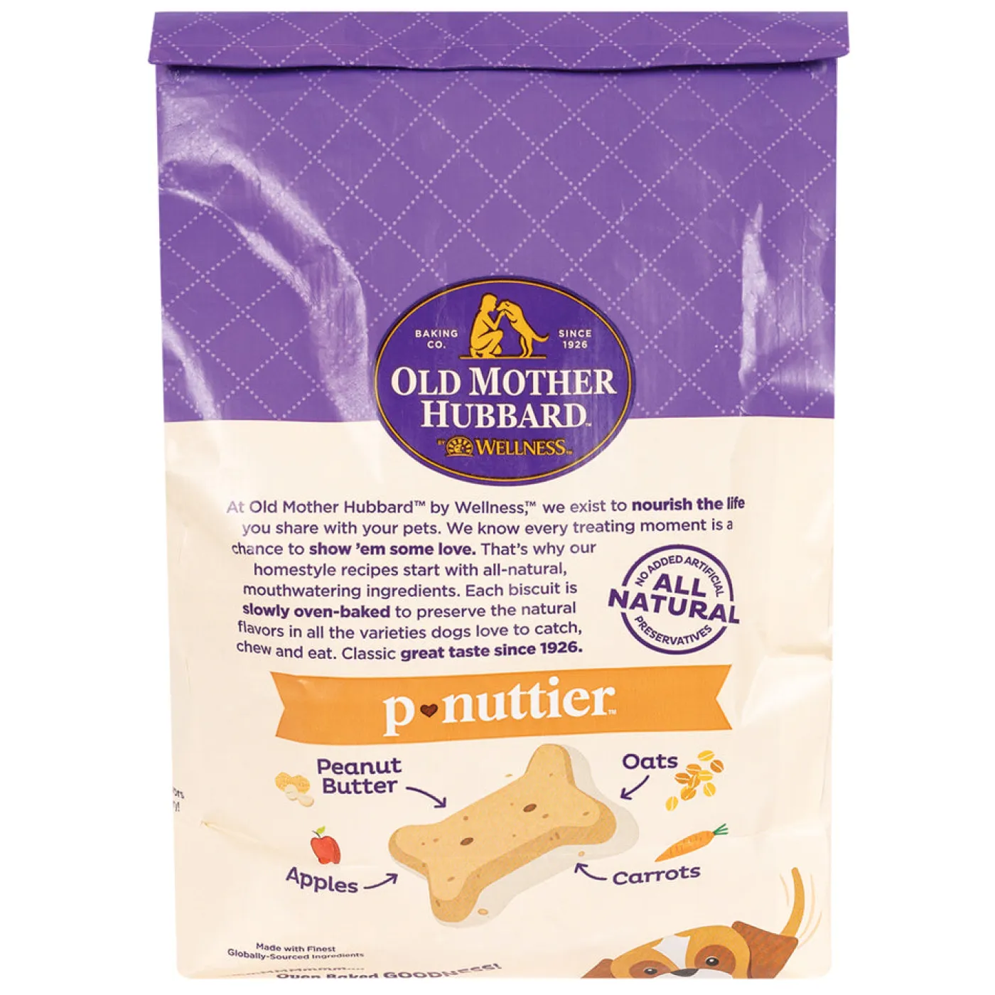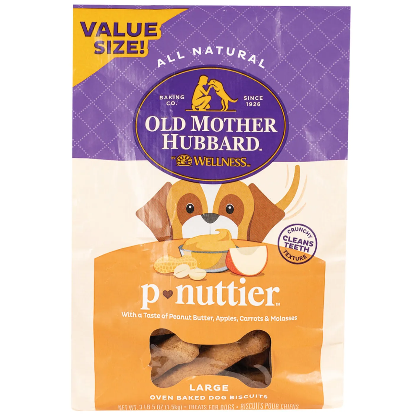 The P-Nuttier natural dog biscuits feature all natural ingredients, natural flavor with the delicious taste of peanut butter, molasses, apples and carrots, as well as a fun dog bone shape and natural crunch your dog will really enjoy. Snack time is a mutually rewarding show of love and positive reinforcement with your dog. You can feel good about training and rewarding your dog with Old Mother Hubbard natural dog treats. Made with real ingredients! Large size is great for medium to large dogs.