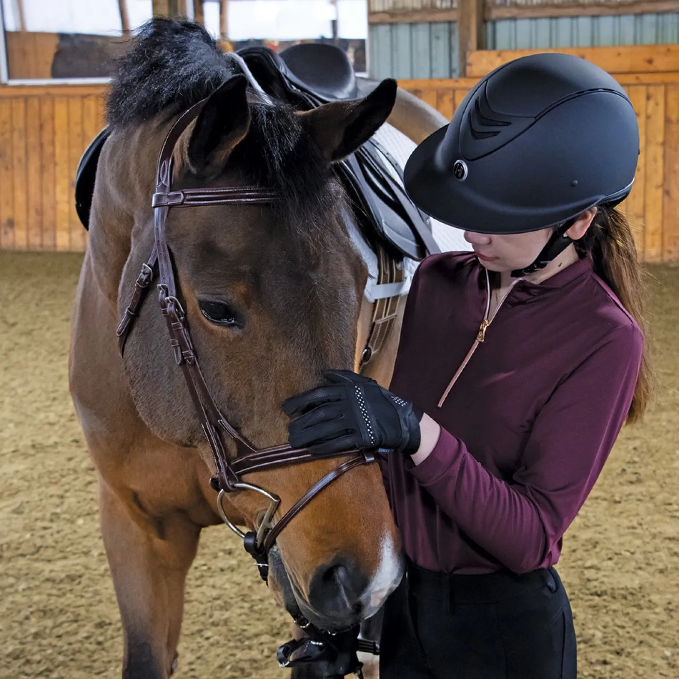 The One K CCS MIPS Avance Wide Brim Helmet features a matte Polycarbonate and Advanced ABS Composite outer shell, with an injection molded shell design, stainless steel mesh vents, and a comfort padded harness with synthetic suede lining. The inside is lined with a washable, quick-dry, moisture wicking liner that can be replaced during washes. Equipped with a Fastex buckle with hook and loop adjustment, and two front, one back, and two center stripe vents. Complete with MIPS which helps reduce rotational motion during the impact of a fall. Suitable for in and out of the show ring with the One K Custom Colour System (pieces sold separately.)