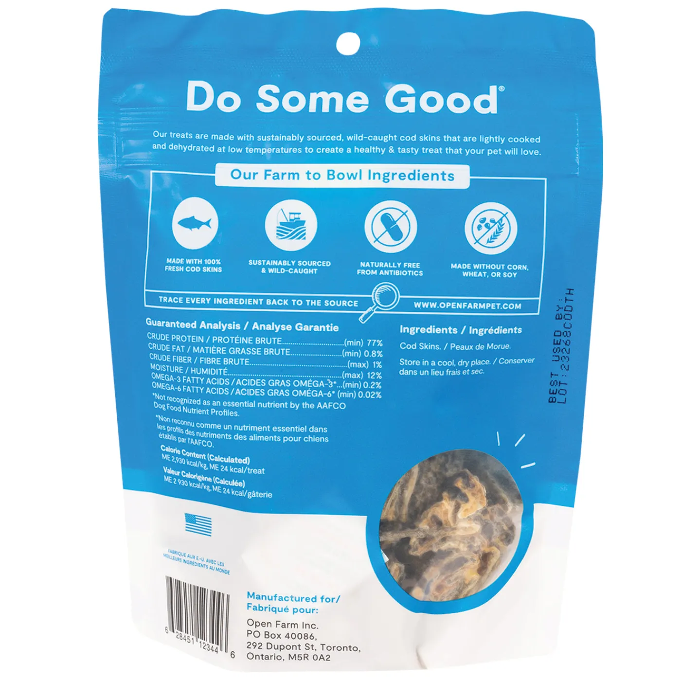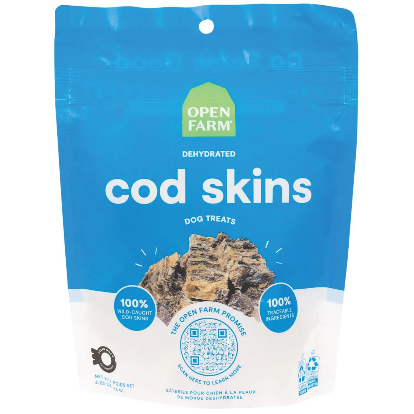 Open Farm Dehydrated Cod Skins Dog Treats are made from wild caught cod that is lightly cooked and dehydrated for delicious flavour. Made from 100% Ocean Wise recommended, wild-caught cod, these low carb treats are perfect for training or for a delicious snack. These single ingredient treats are great for pets with food sensitivities. A great source of omega fatty acids. Contain no glycerin, gluten, grains, corn, soy, artificial colours or preservatives. 100% traceable.