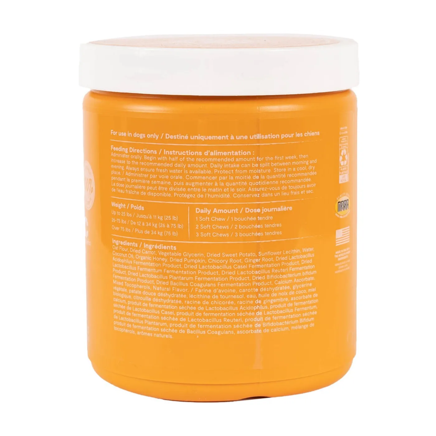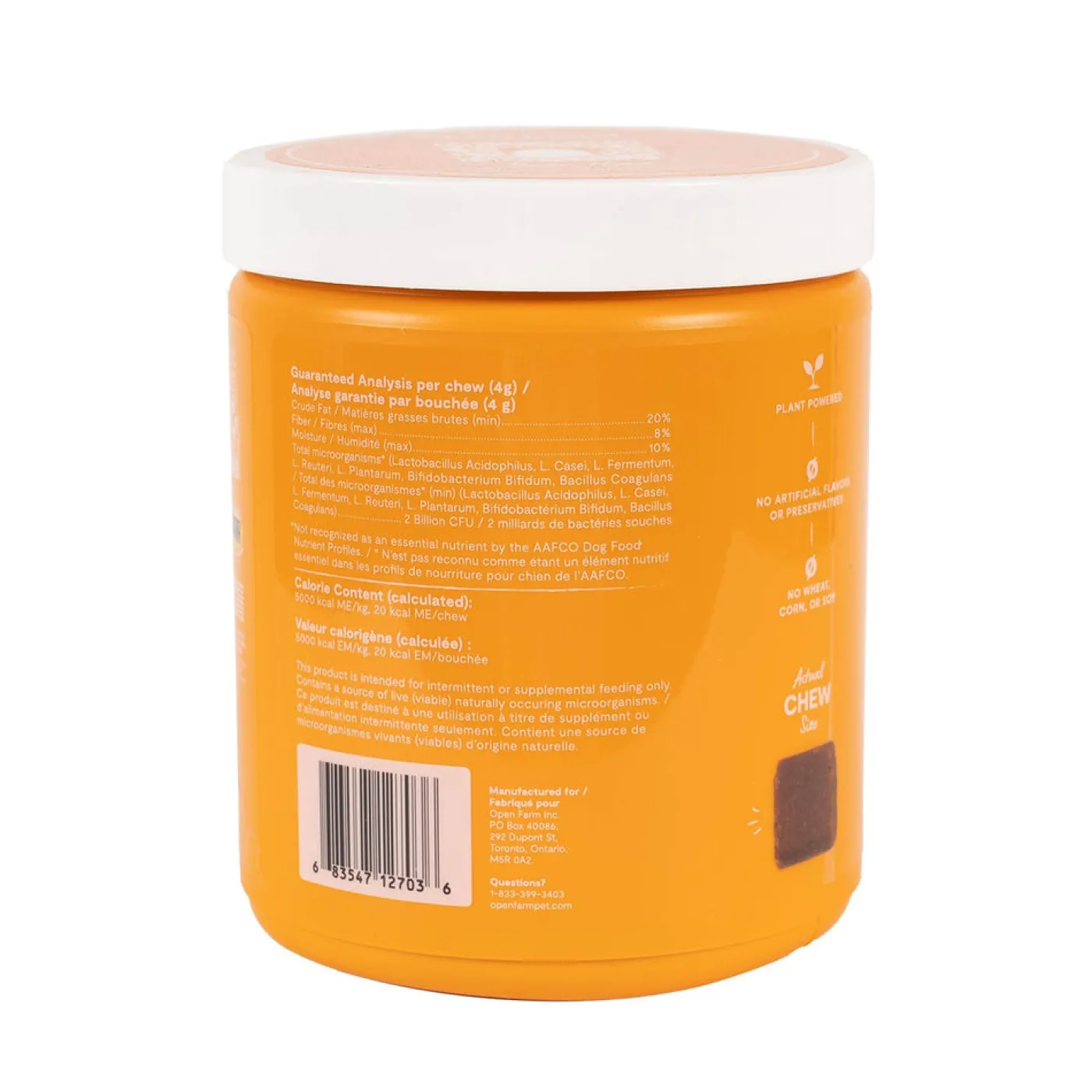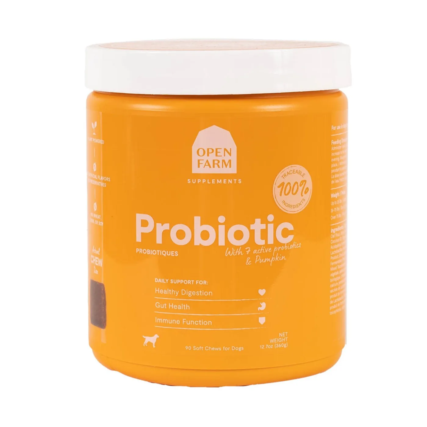 Open Farm Probiotic Chews are made to help support normal gut flora and bowel movement. Formulated with 100% traceable ingredients. Each package contains 90 oral chews. Packaged in a 100% recyclable resealable jar.