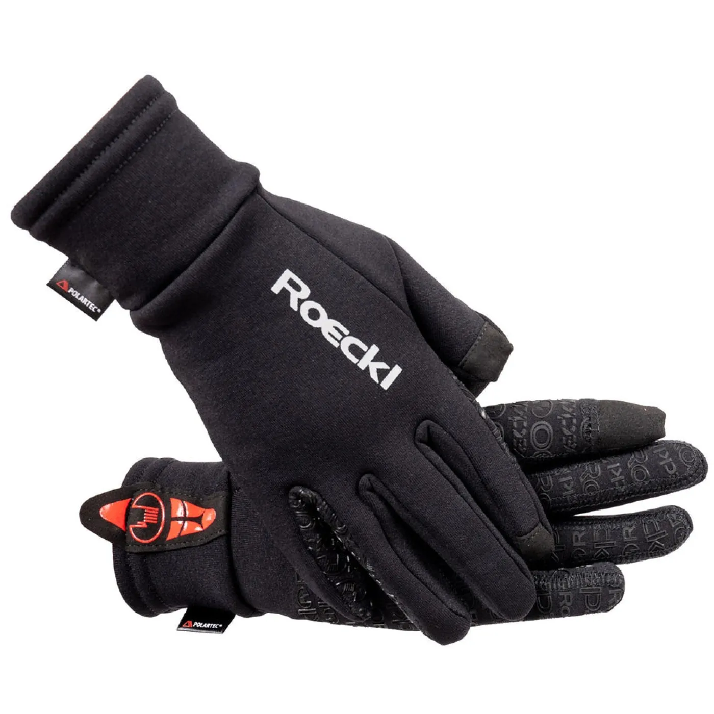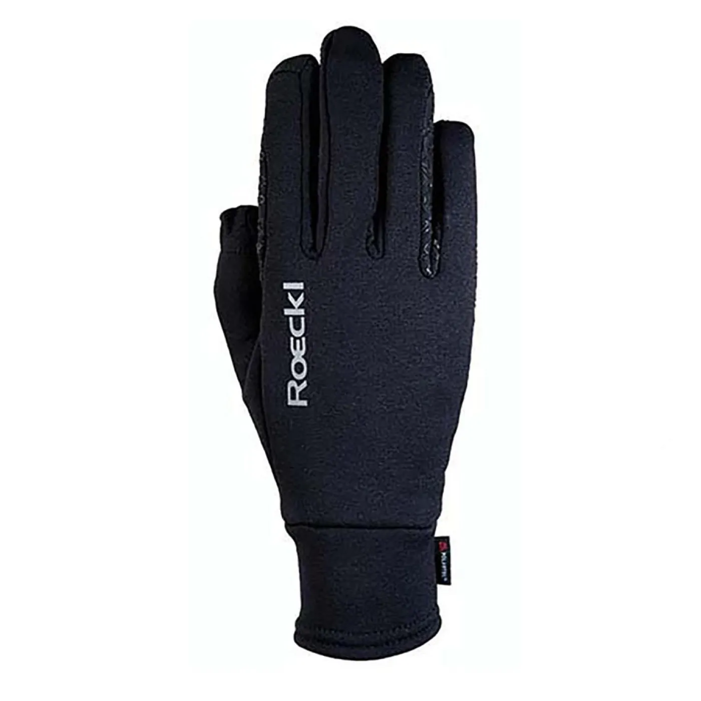 Highly versatile and extremely elastic; Roeckl Sports presents the Weldon. This all-rounder is touchscreen compatible, allowing you to use your smartphone without having to take off your gloves. The thumb and index finger were designed using the sophisticated 3D cut to enable quicker and easier use of the touchscreen without compromising wear comfort. Thanks to Roeckl’s exclusive comfort-cut, extra trimming on the index finger is not required. The backhand and palm are made from warm, soft Polartec® Power Stretch® Pro. The materials’ particularly heavy quality guarantees extra warmth, while the flatlock seams provide increased wear, comfort and grip. The palm featuring countless siliconized little Roeckl hand logos help offer a perfect grip on the reins. The area between the ring finger and the little finger, which comes into contact with the reins, features an additional siliconized reinforcement. Pull-on construction makes it easier to put on the gloves.
