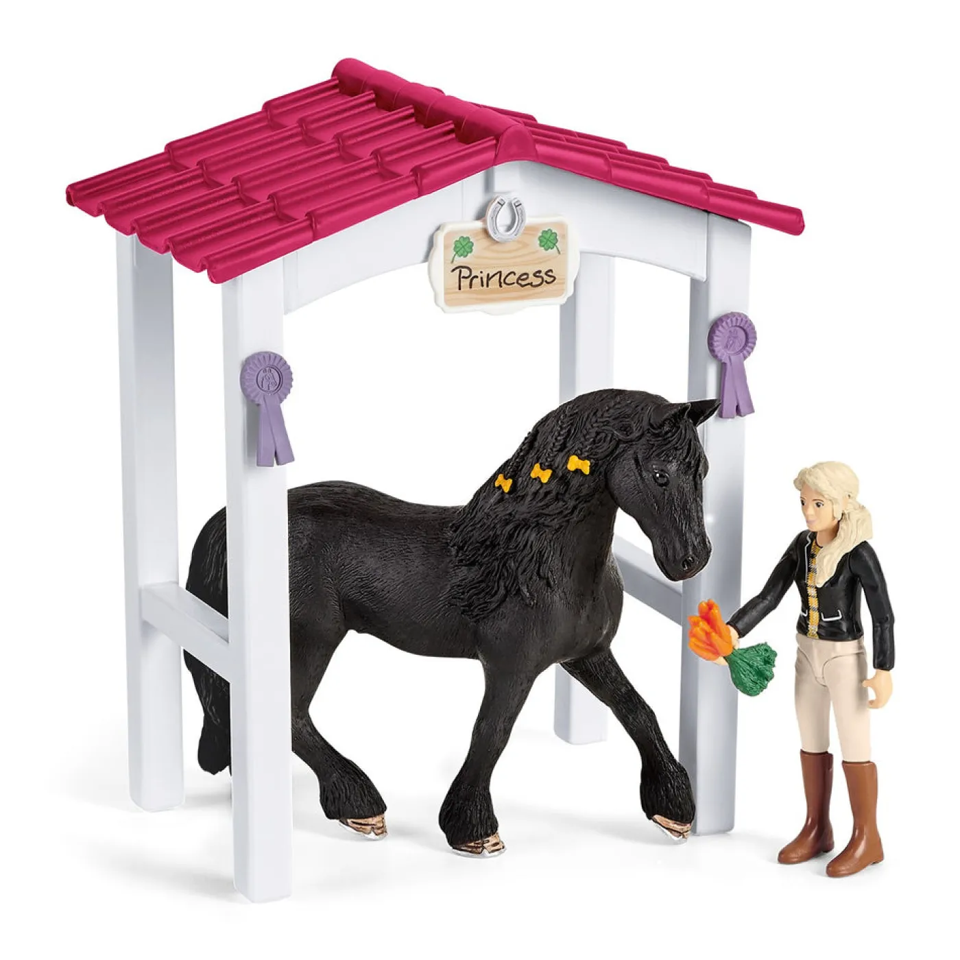 The Horse Box with Horse Club Tori & Princess from Schleich® Horse Club is lovingly designed. The prize ribbons, gold medal and trophy show shared riding achievements that the fully moveable Tori figurine has had with her beautiful Frisian mare, Princess. The walls of the box are decorated with beautiful stickers that can be written on. The roof is removable and can be used as a separate stable. Bridle, reins and saddle are ready for the next training – as is the carrot for a reward. While the mare stands contentedly at the hay rack and trough, Tori’s cute chihuahua, Beauty, runs around the box.