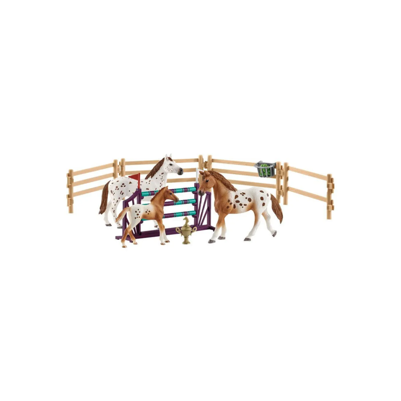 Help Lisa train her Appaloosas for the horse show! Includes an Appaloosa mare, gelding, and foal with a paddock, hay rack, apples, obstacle, and trophy. Modelled in the finest detail to help children learn as they play. Suitable for ages 5-12.
