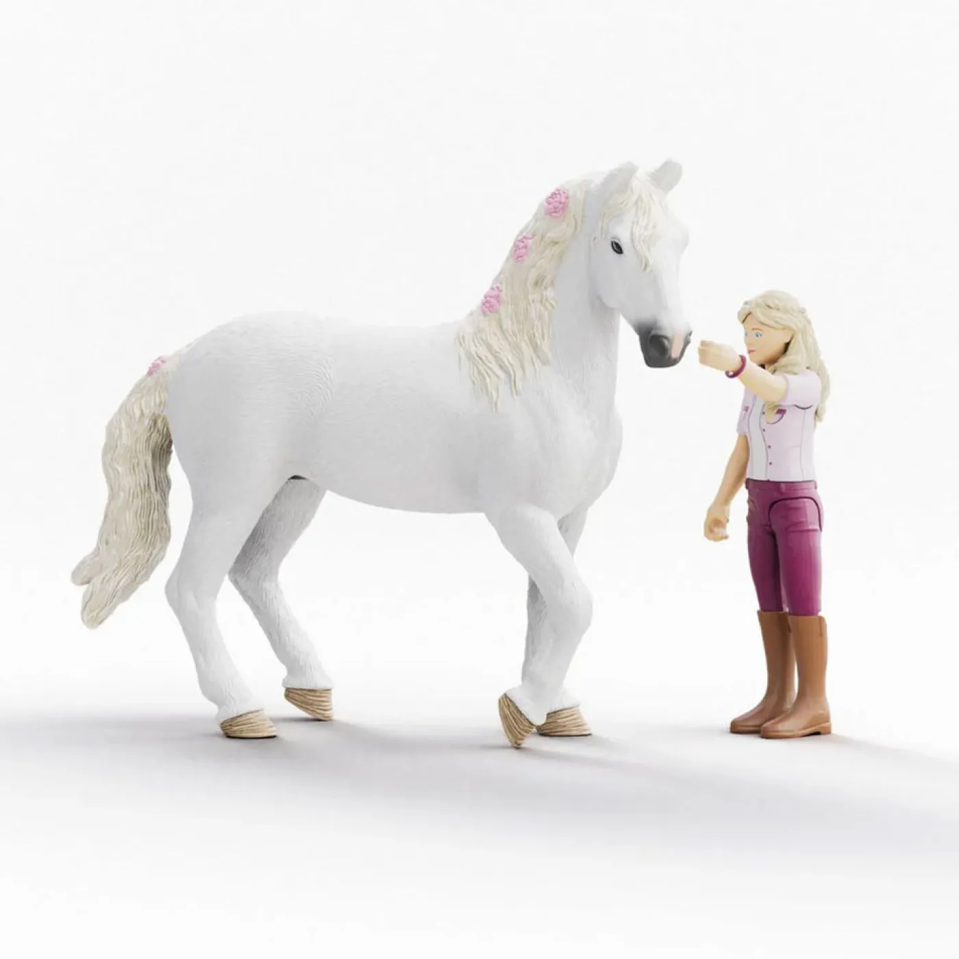 A world of friendship and adventure awaits with the Sofia & Blossom playset from Schleich®. Gallop into the heart of the horse lover in your life with this Andalusian mare figurine and her devoted rider! The rider figurine now has movable legs so she can sit in the saddle!