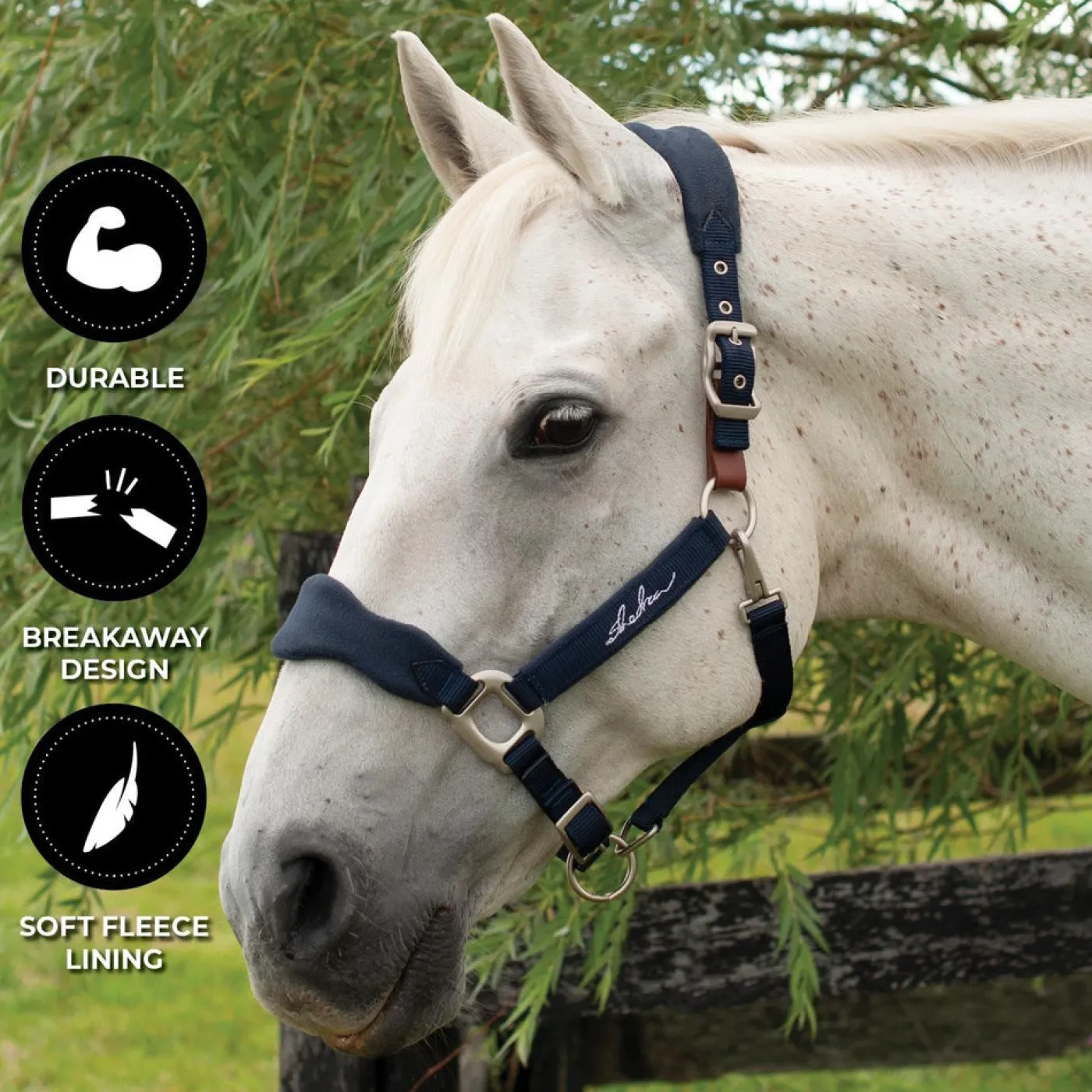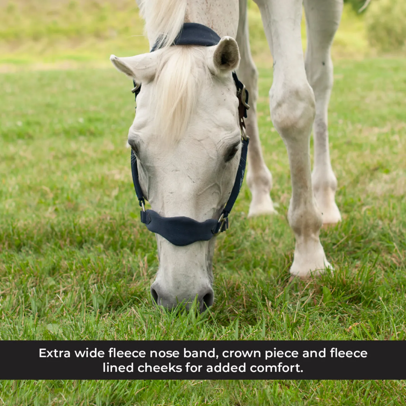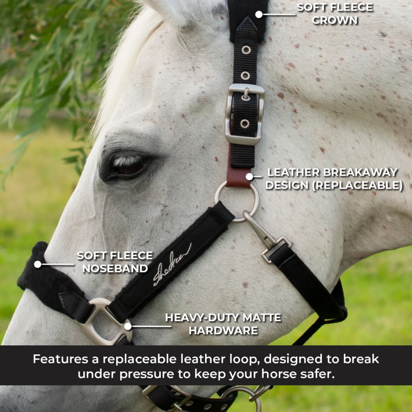 Constructed from durable, doubled nylon, this Shedrow halter is made tough to stand up everyday barn wear and features a leather breakaway at the left hand side of the crownpiece in case of an incident. The Shedrow Breakaway Halter includes fleece at the nose and crown with fleece lining on the cheek pieces for all day comfort. Finished with matte plated hardware.