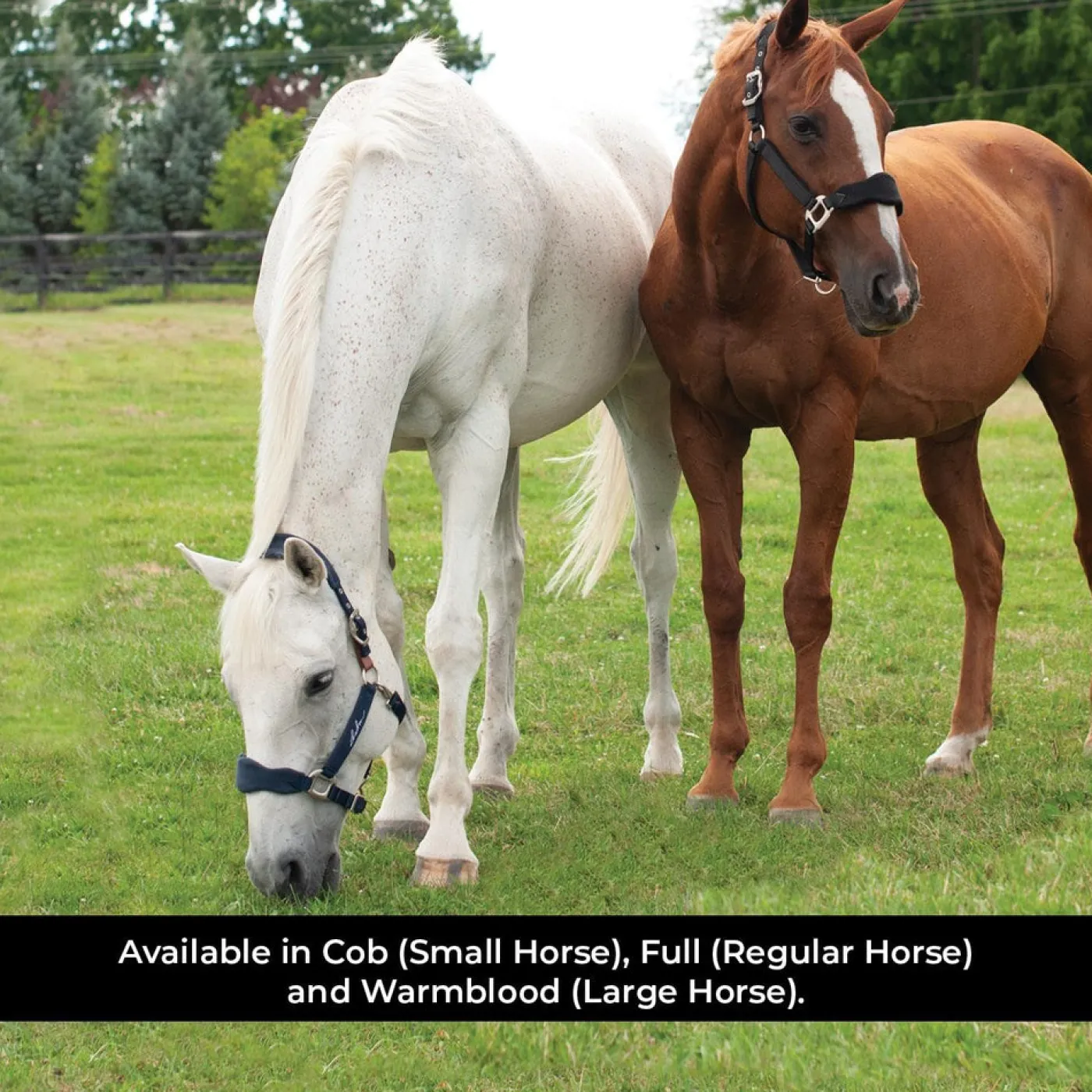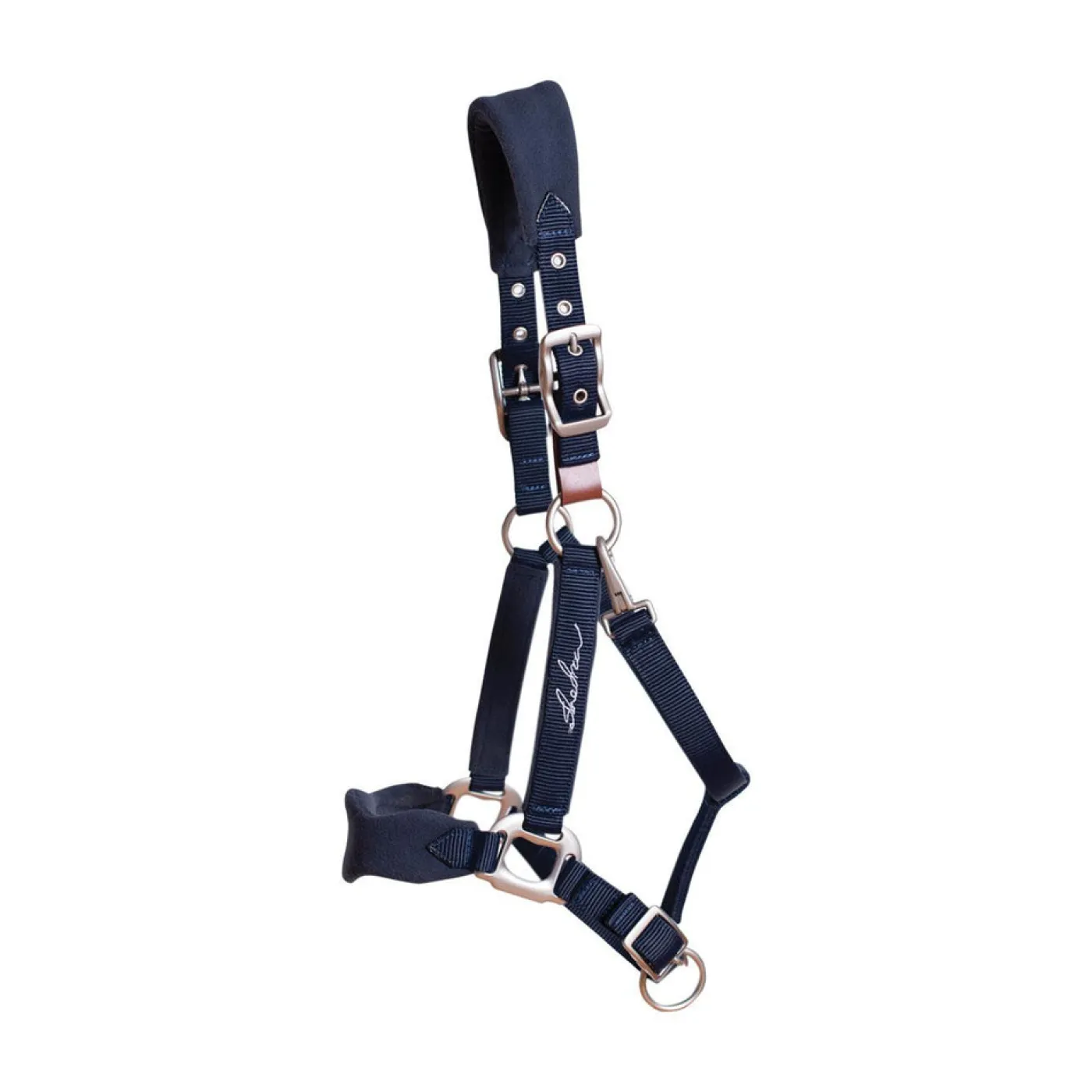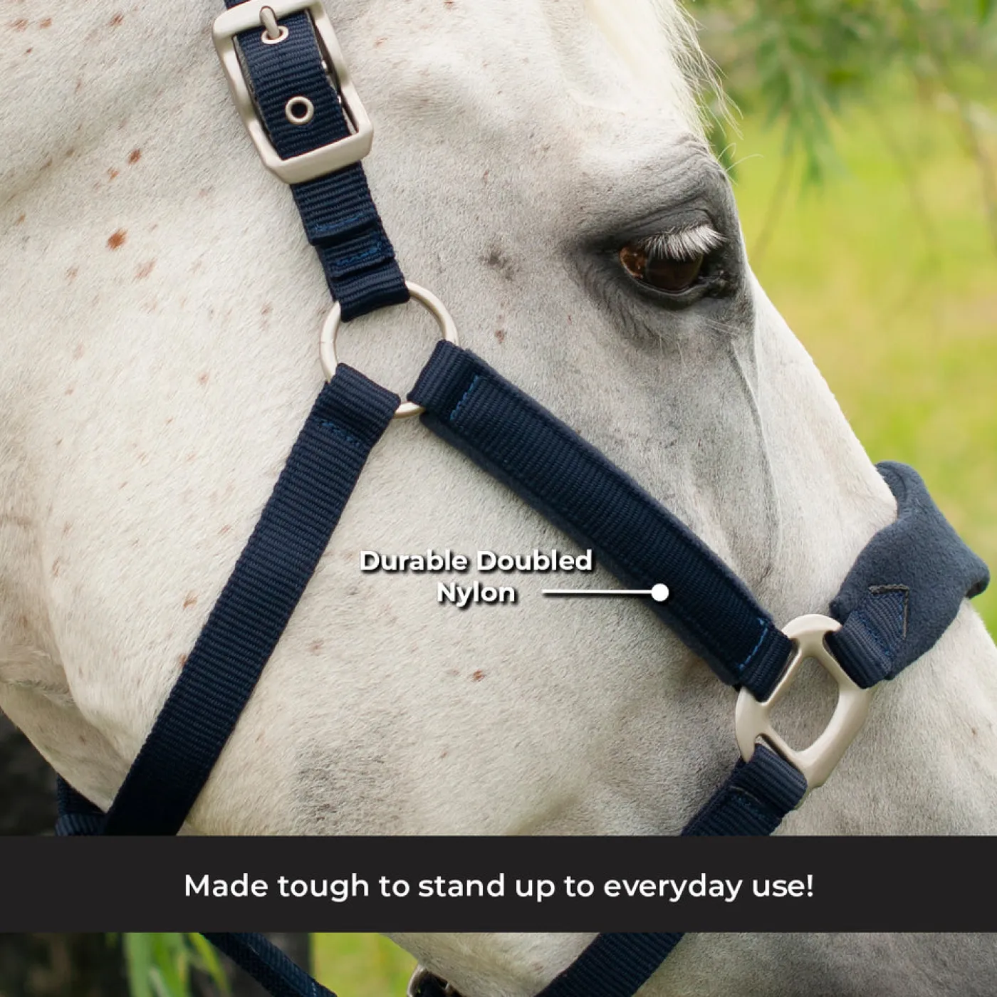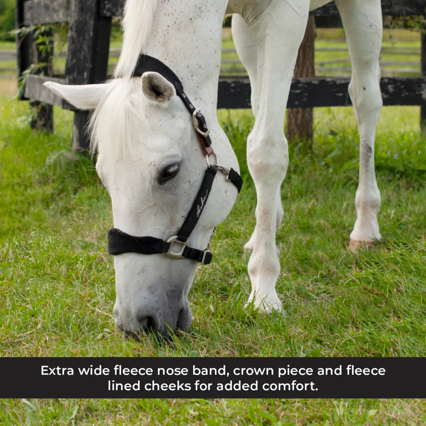 Constructed from durable, doubled nylon, this Shedrow halter is made tough to stand up everyday barn wear and features a leather breakaway at the left hand side of the crownpiece in case of an incident. The Shedrow Breakaway Halter includes fleece at the nose and crown with fleece lining on the cheek pieces for all day comfort. Finished with matte plated hardware.