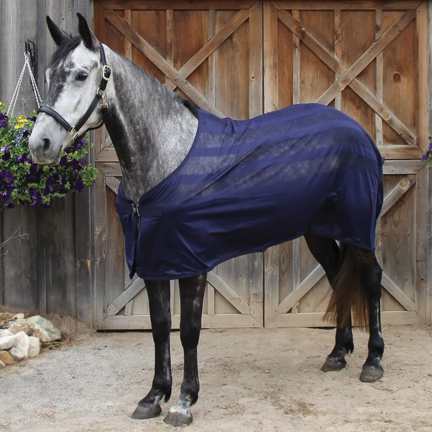 The Shedrow Breeze Scrim is the perfect accessory for the season! Throw on after bathing to shield dust and flies or during a show to keep your horse cool and relaxed. Velcro front closure and tail string hold the sheet in place. Subtle mesh pattern makes it ultra-breathable and adds a little flair to the look.