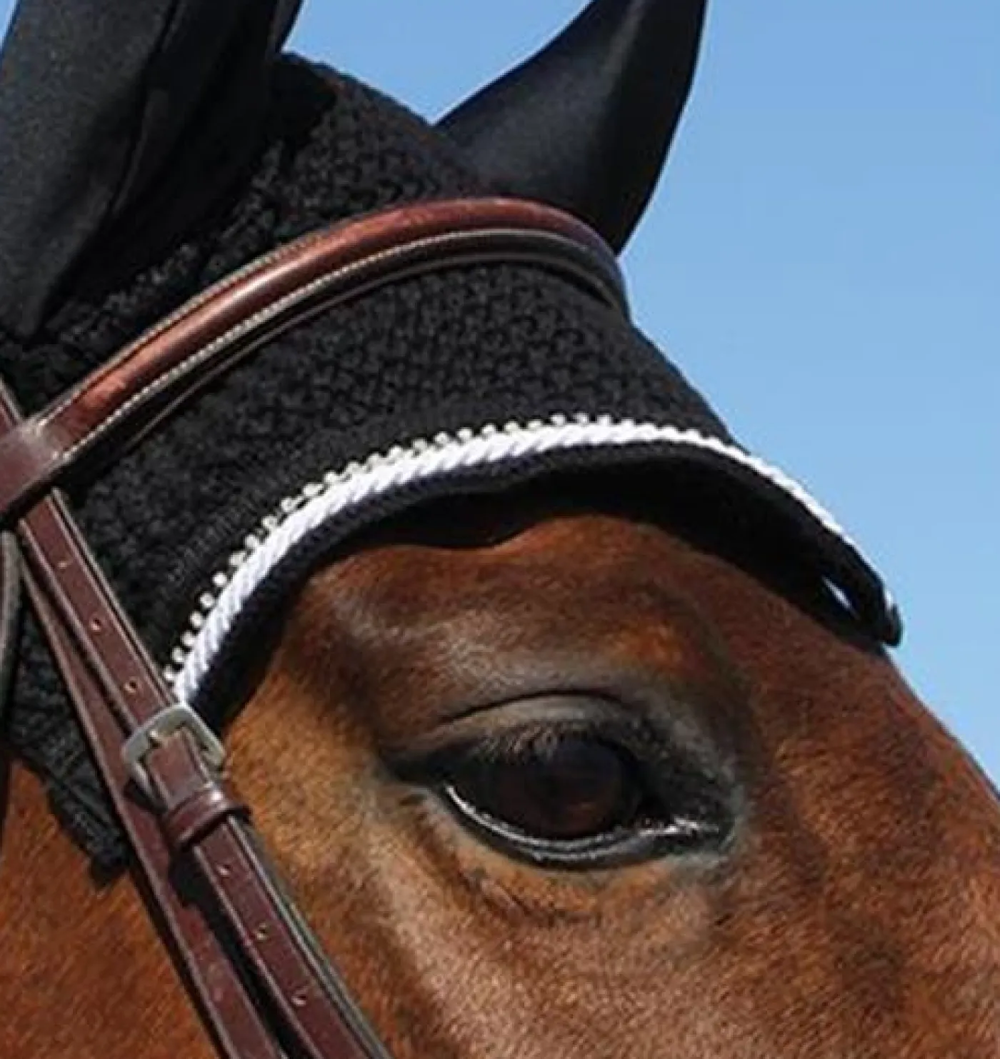 Stylish and durable, the Shedrow Deluxe Fly Veil is constructed with a crochet design for maximum breathability in or out of the show ring. Great for adding personal flair to your show ring look or for aiding in fly protection, this veil covers your horse’s ears for long-lasting coverage. Features a corded rope inlay and a single row of crystals for exceptional elegance.