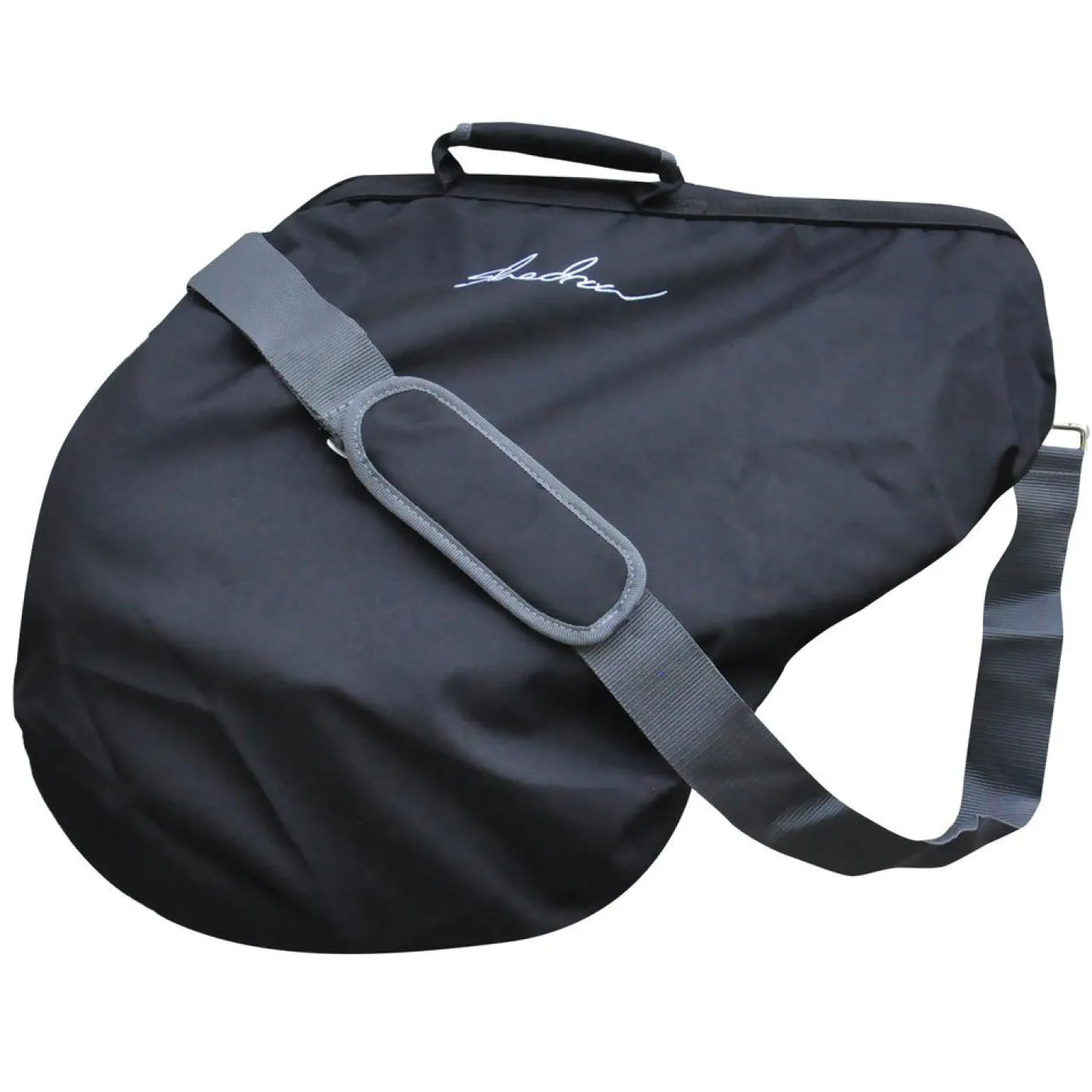 Shedrow English Saddle carrying cover features an innovative new design allowing it to be carried. Complete with an adjustable shoulder strap and carrying handle, as well as an elastic perimeter to fit snug against your saddle. A convenient gullet strap allows you to secure the cover to your saddle for easy transportation. Perfect for show day or protecting your saddle while not in use.