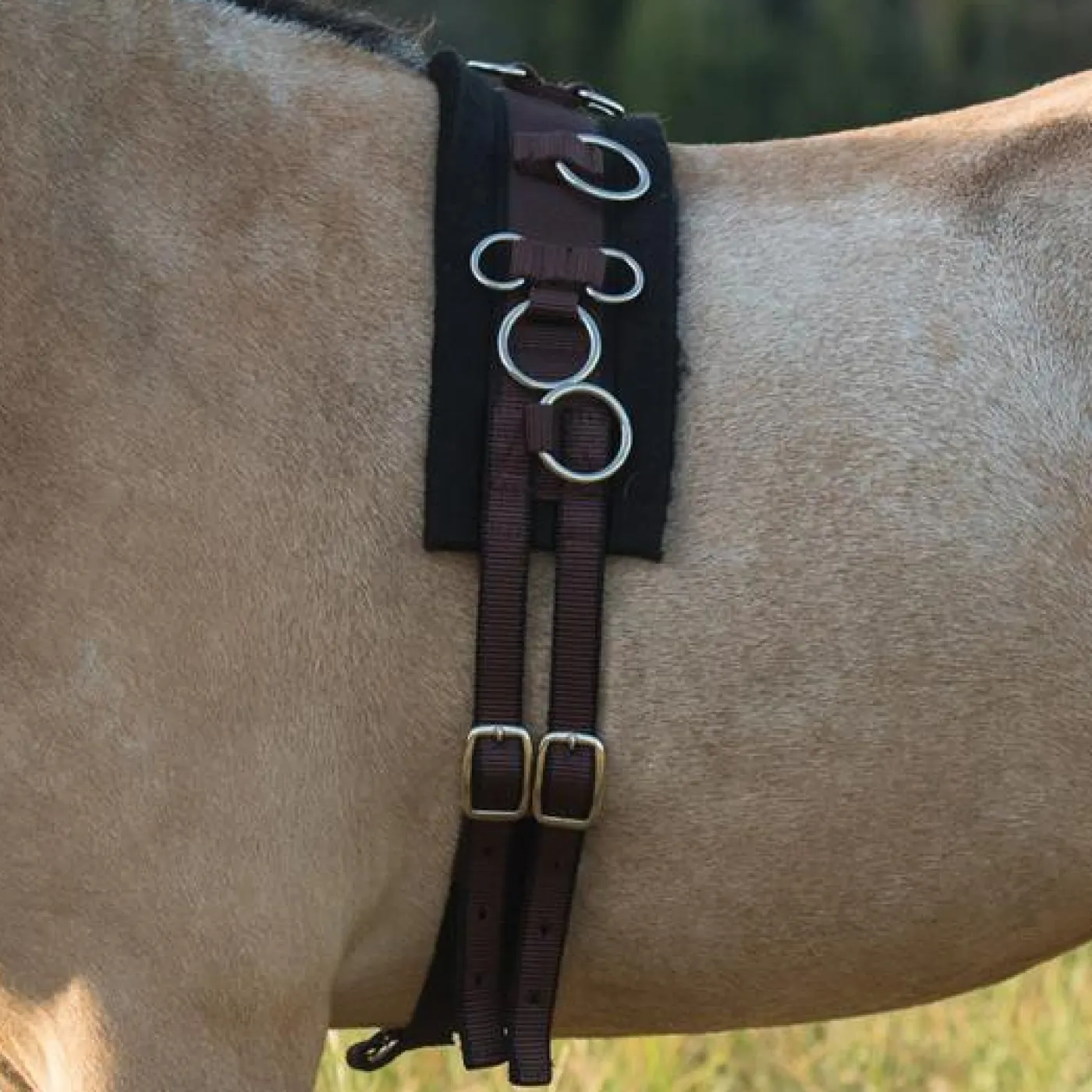 Professionally engineered training surcingle made of durable nylon with felt padding. Metal rings and dees are strategically positioned for attaching training aids. Girth adjusts on both sides to equalize pressure. Ideal for most schooling needs. Minimum 41” to Maximum 51”.