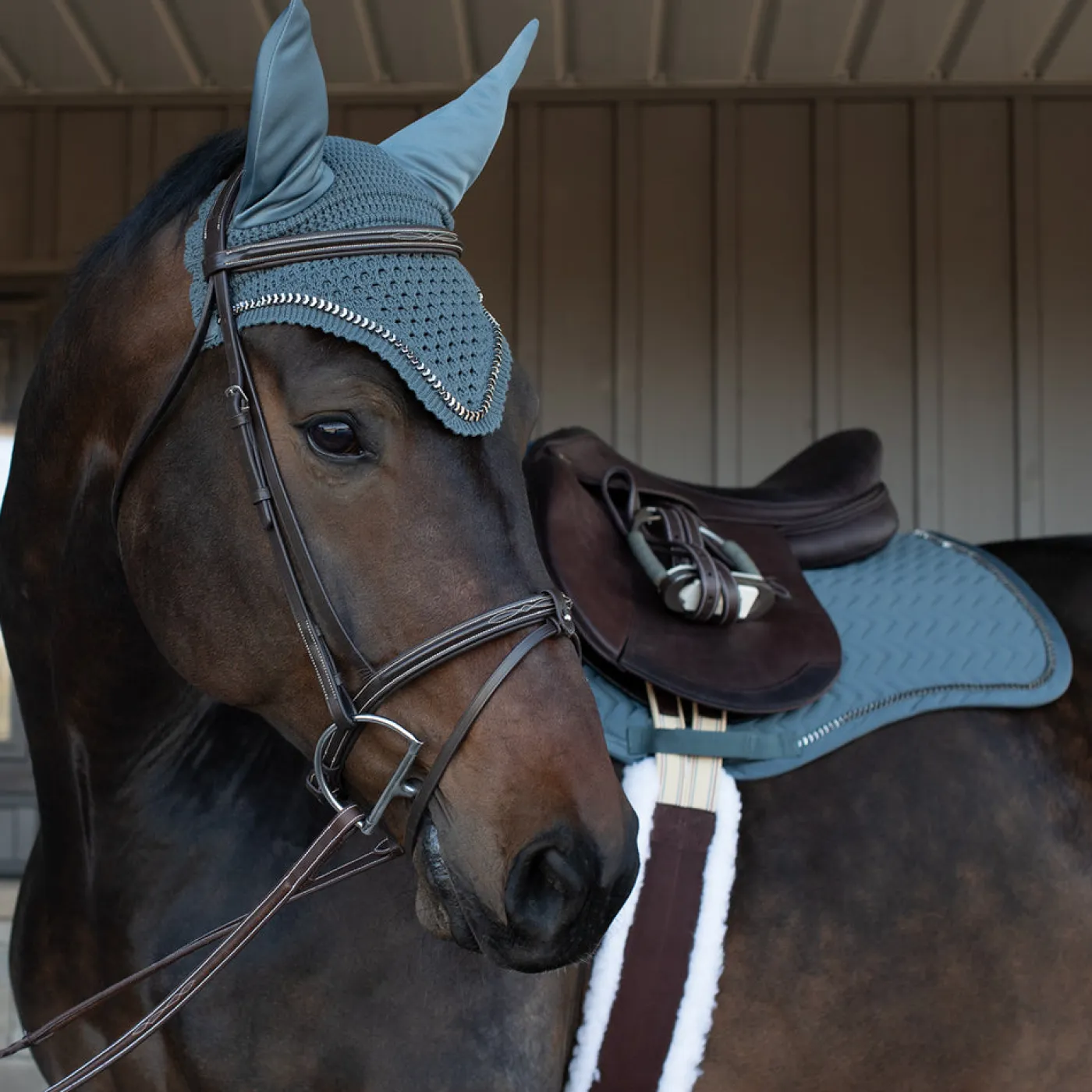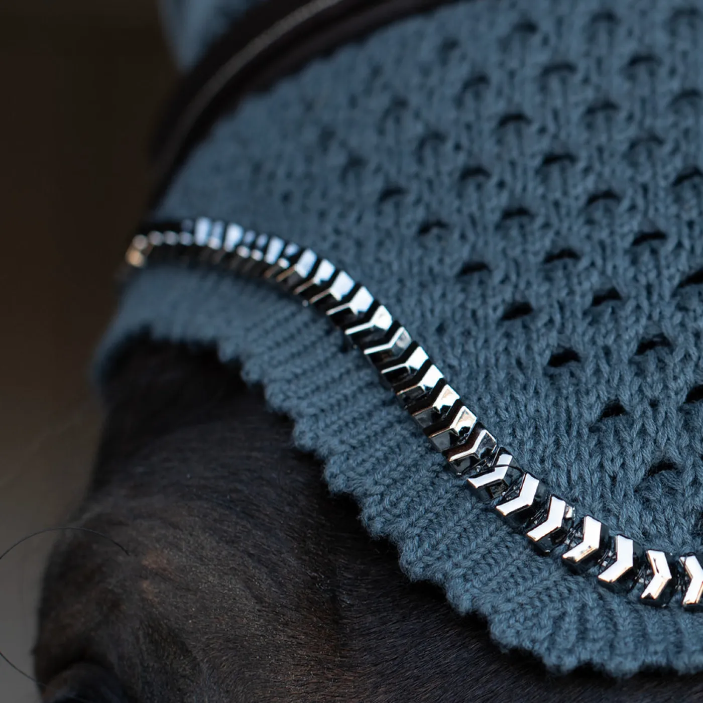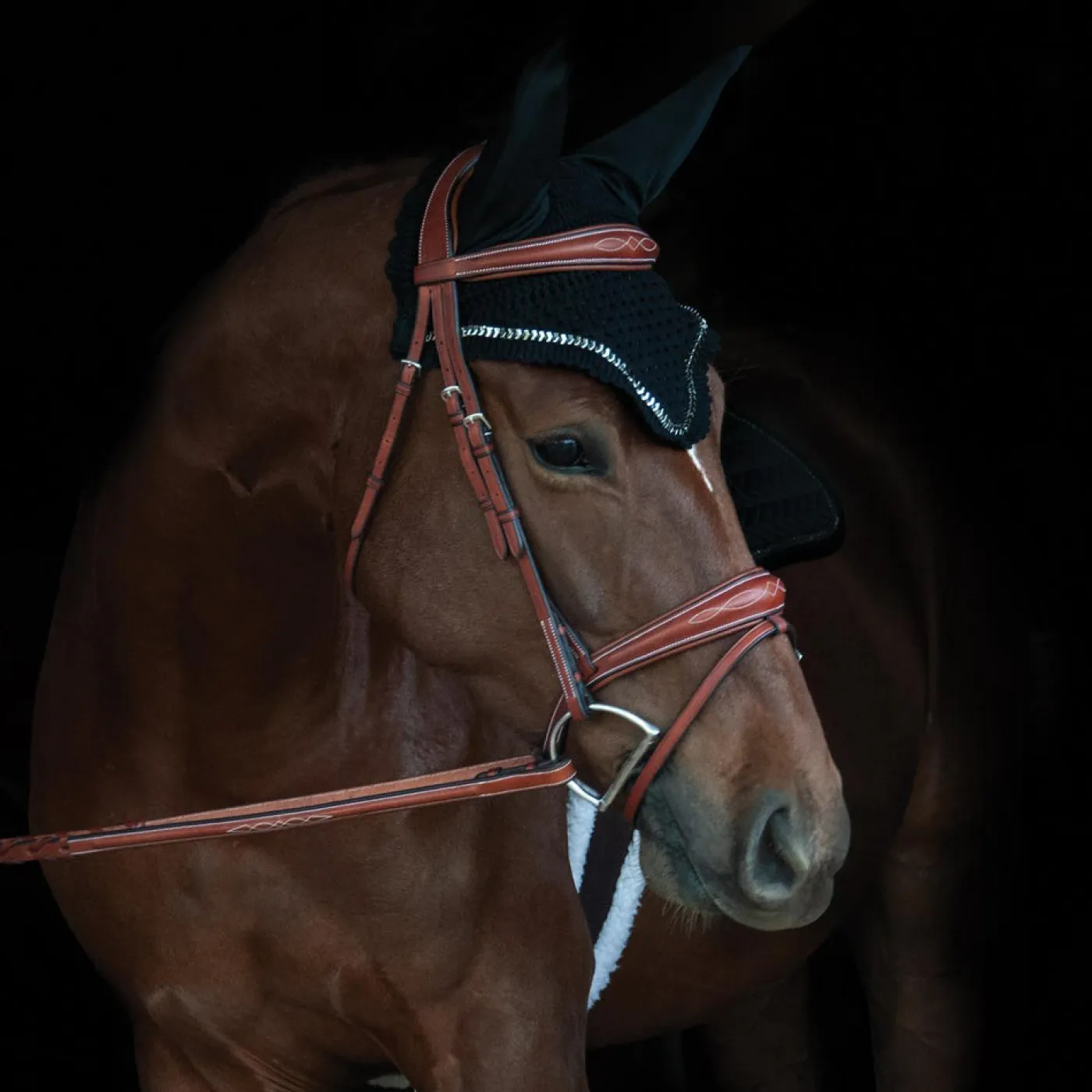 Stylish and durable, the Shedrow Saber Fly Veil is constructed with a crochet design for maximum breathability, and topped with stretchy ears for maximum comfort. Great for adding personal flair to your show ring look or for aiding in fly protection! Matches the Shedrow Saber Saddle Pad.