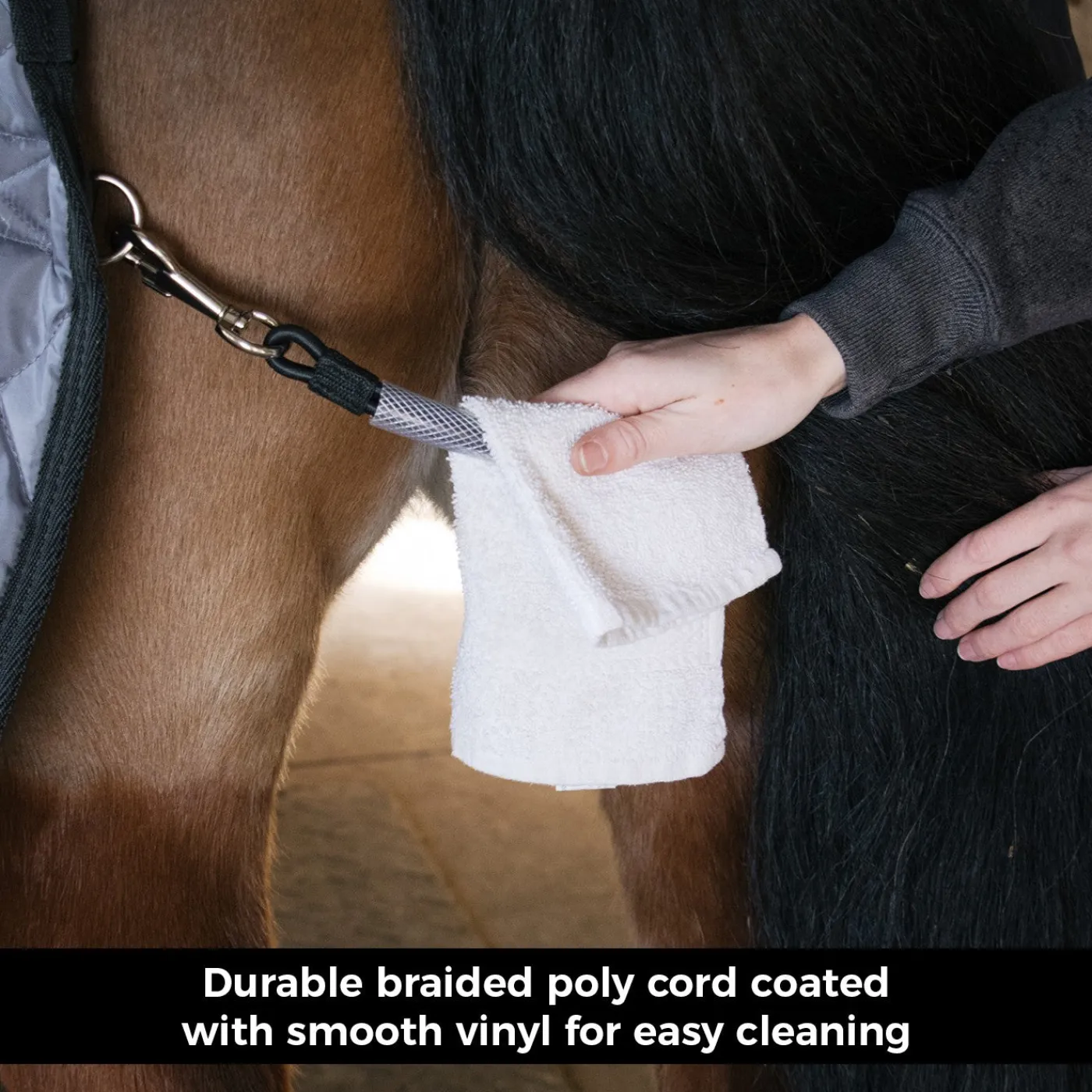 The Shedrow Tail Cord Replacement is the perfect add-on for your horse’s blankets! This removable tail cord is made from durable braided poly and covered with vinyl for easy cleaning. Use to replace old, damaged tail cords or to add to your blankets for an added layer of safety. Finished with nickel plated snaps on each end for easy attachment and removal. Measures 19″ long.