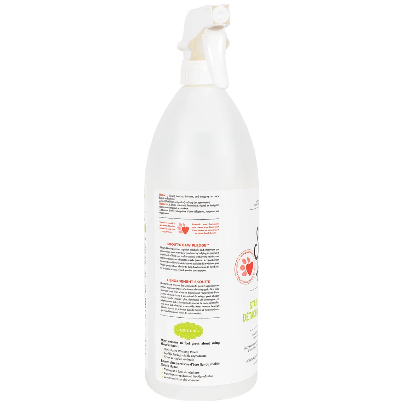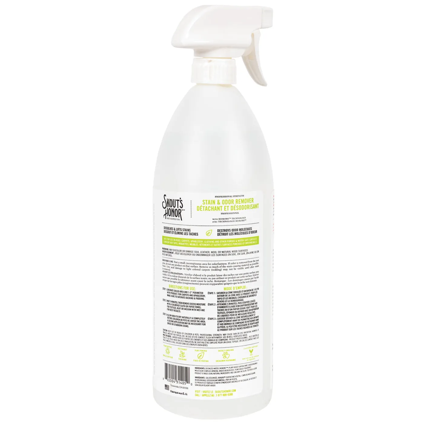 The Skout’s Stain & Odour Remover remove pet stains and odour quickly and easily. From muddy paws to severe pet messes, this spray is fast-acting and effective. Safe for use on carpet, rugs, tile, laminate, upholstery, bedding, clothing and any other porous & water-safe surface. Great for a variety of pet stains including urine, feces, blood, mud, grease and even wine! Contains no harsh chemicals, eco-friendly and laundry safe. Not recommended for natural surfaces such as wool, leather and unsealed wood. 35 oz./1035 mL.