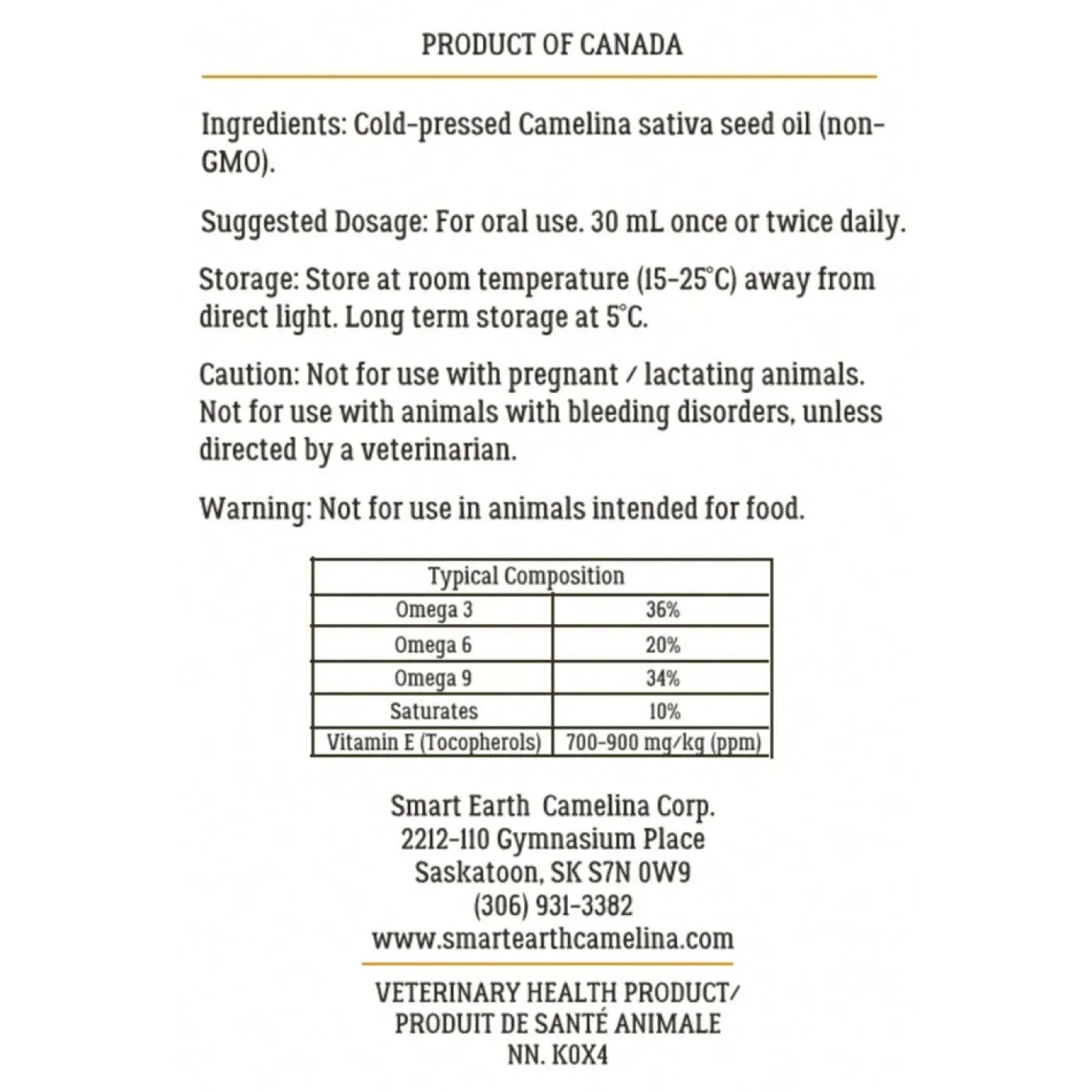 Smart Earth Camelina Oil is a palatable omega supplement that may promote healthy weight gain, support dry skin and coat, and support mane and tail quality. Camelina Oil contains Vitamin E that may help your horse grow a healthier coat. Relative to other vegetable sources of omega fatty acids, camelina oil contains the most balanced profile of omega 3 and 6 with a ratio 1.2-1.6:1 and high ALA content. Smart Earth Camelina Oil is non-GMO, glyphosate free, cold pressed and made in in a human food grade facility. Sustainably produced, Smart Earth uses crops that require minimal irrigation or fertilization, and has a smaller carbon footprint than protein-based omega sources such as fish oils. Produced in Saskatchewan, Canada.