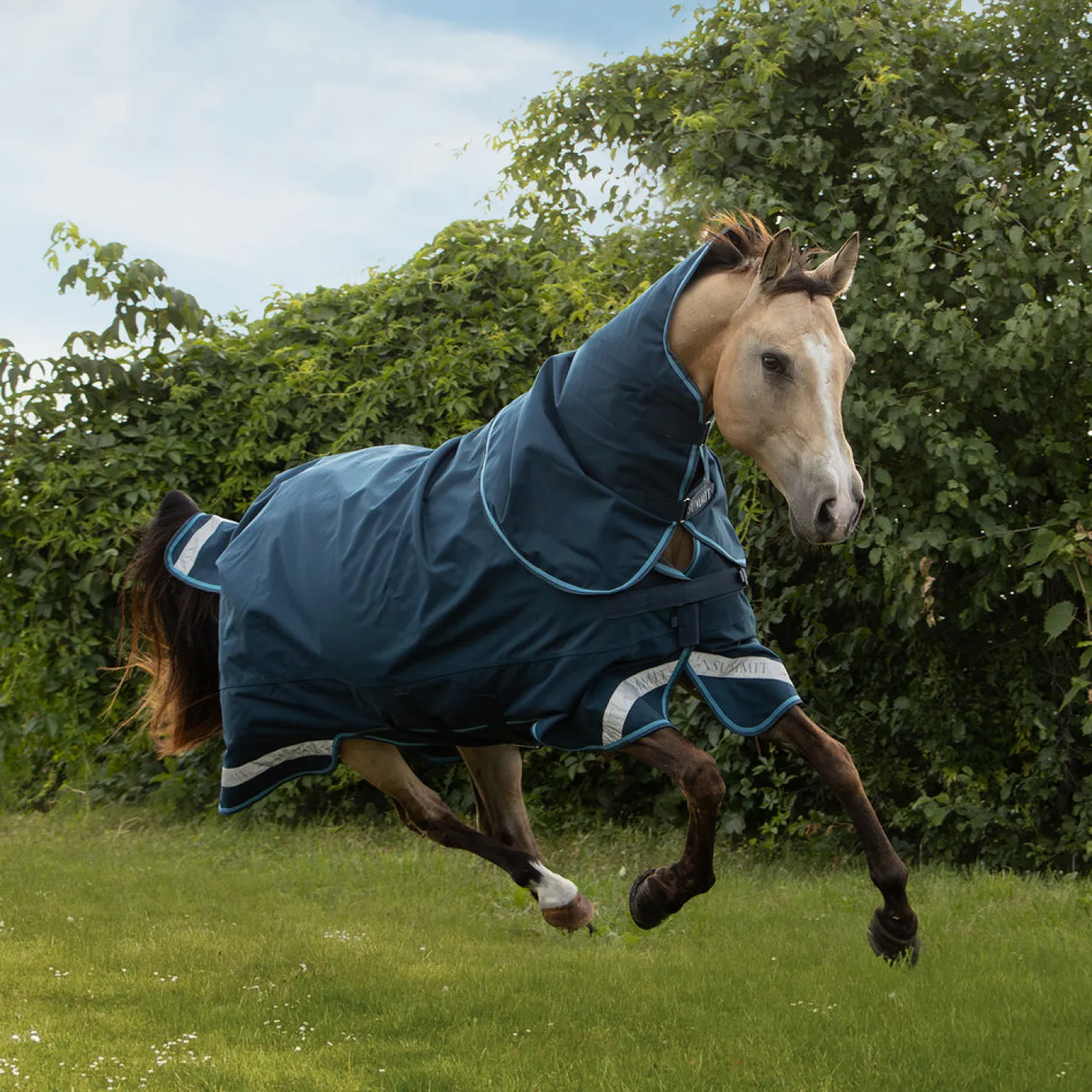 The Summit Nova Rainsheet offers protection to your horse during rainy weather. Made from 1050D Cordura ballistic nylon to withstand the elements. Features a 3 surcingle belly closure to keep blanket in place and internal wither padding to prevent rubs. Complete with a wipe-clean tail cord, and gun-metal hardware. Sold with matching hood for added coverage.