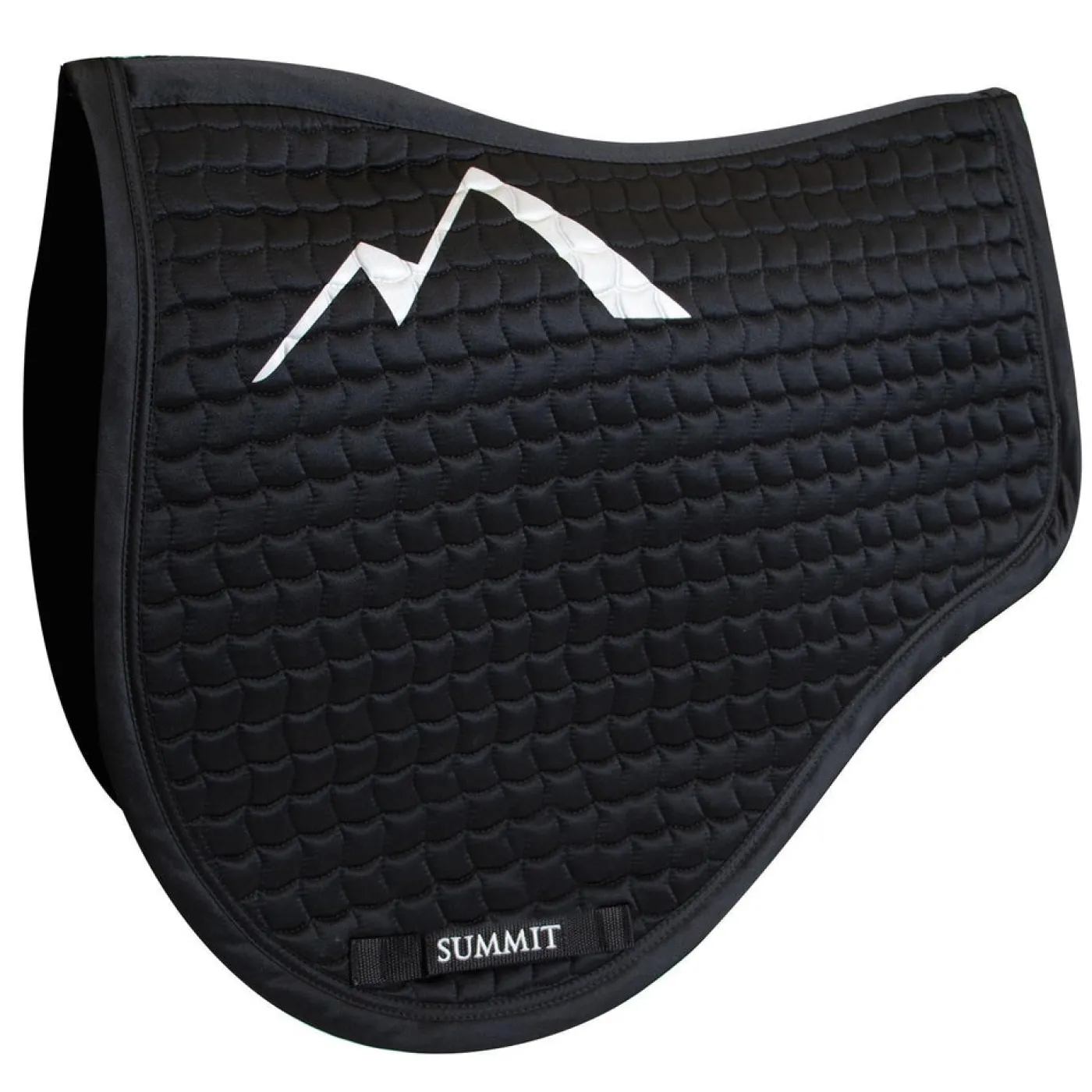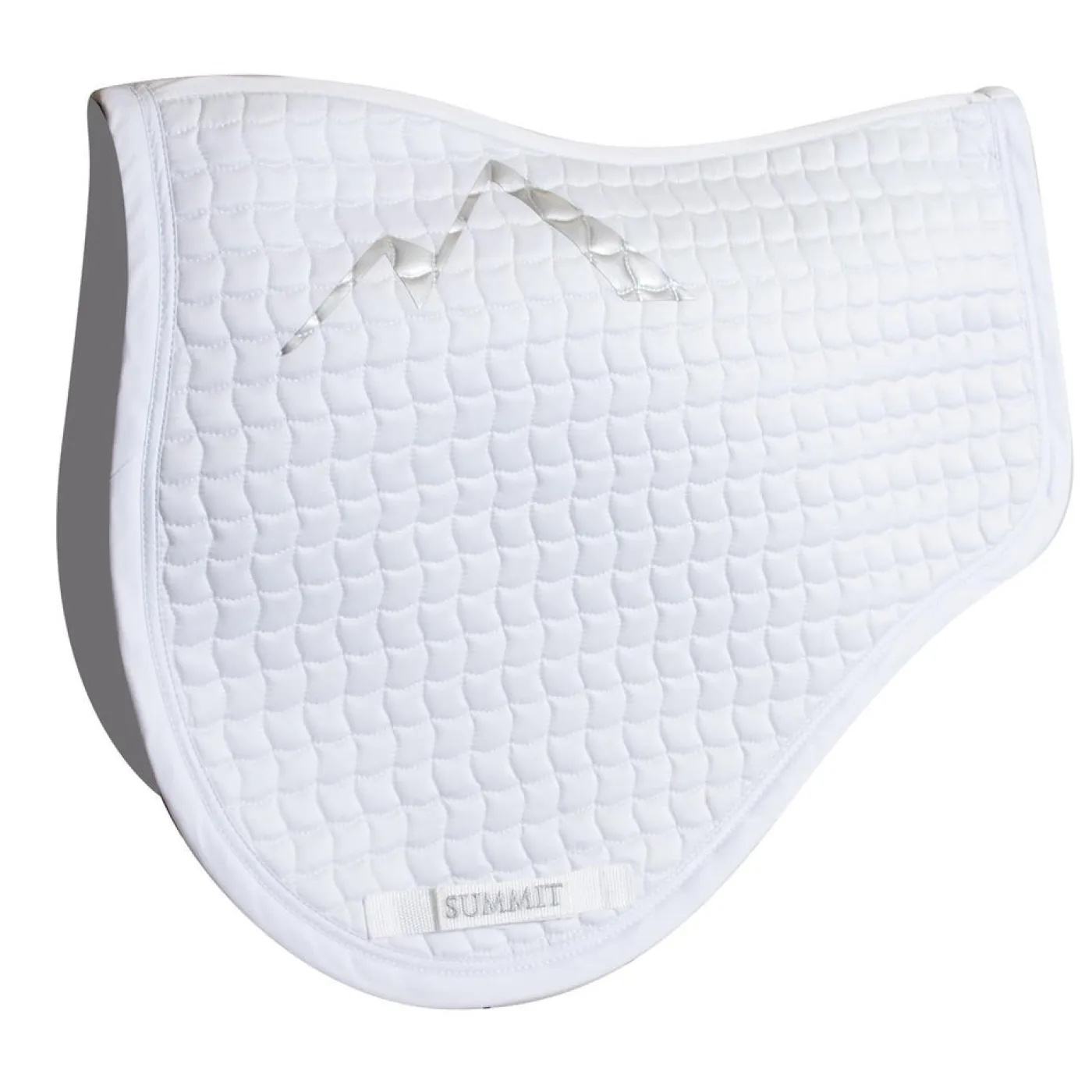 Make a bold statement with Summit’s Prix Saddle Pad featuring a trendy euro cutaway hem and chic 10 mm flat tone-on-tone piping. Soft yet durable quilted cotton underside offers supreme comfort for your horse and the non-slip branded silicone grip text helps stabilize your saddle. Complete with Velcro girth loops. Billet straps not included.