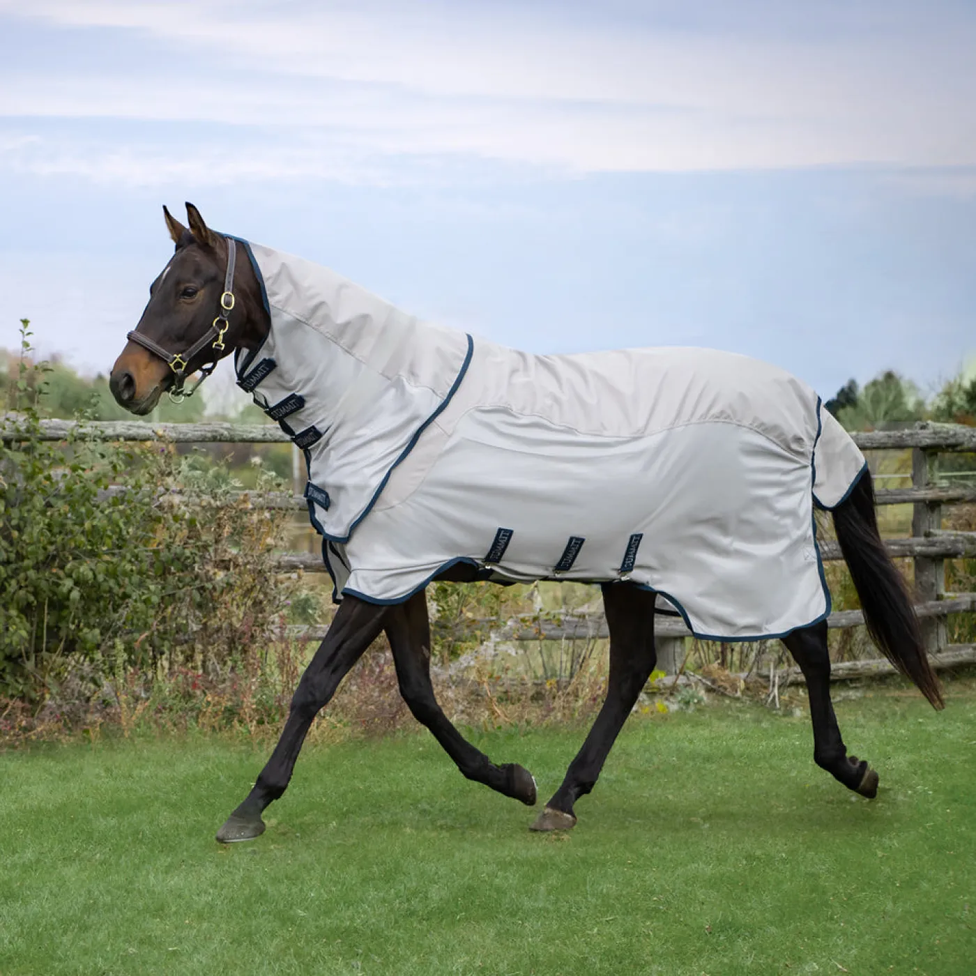 The hybrid Summit Verano Fly Rainsheet features a waterproof upper and a mesh lower to keep your horse dry but cool in the spring, summer and fall. This hybrid sheet blocks more then 80% of UVA and UVB rays while remaining exceptionally durable and breathable. Belly band and extra long front neck coverage with a tab to attach to the halter or fly mask give your horse full coverage from biting insects. Overloq front closure system and triple belly surcingles ensure a perfect fit.
