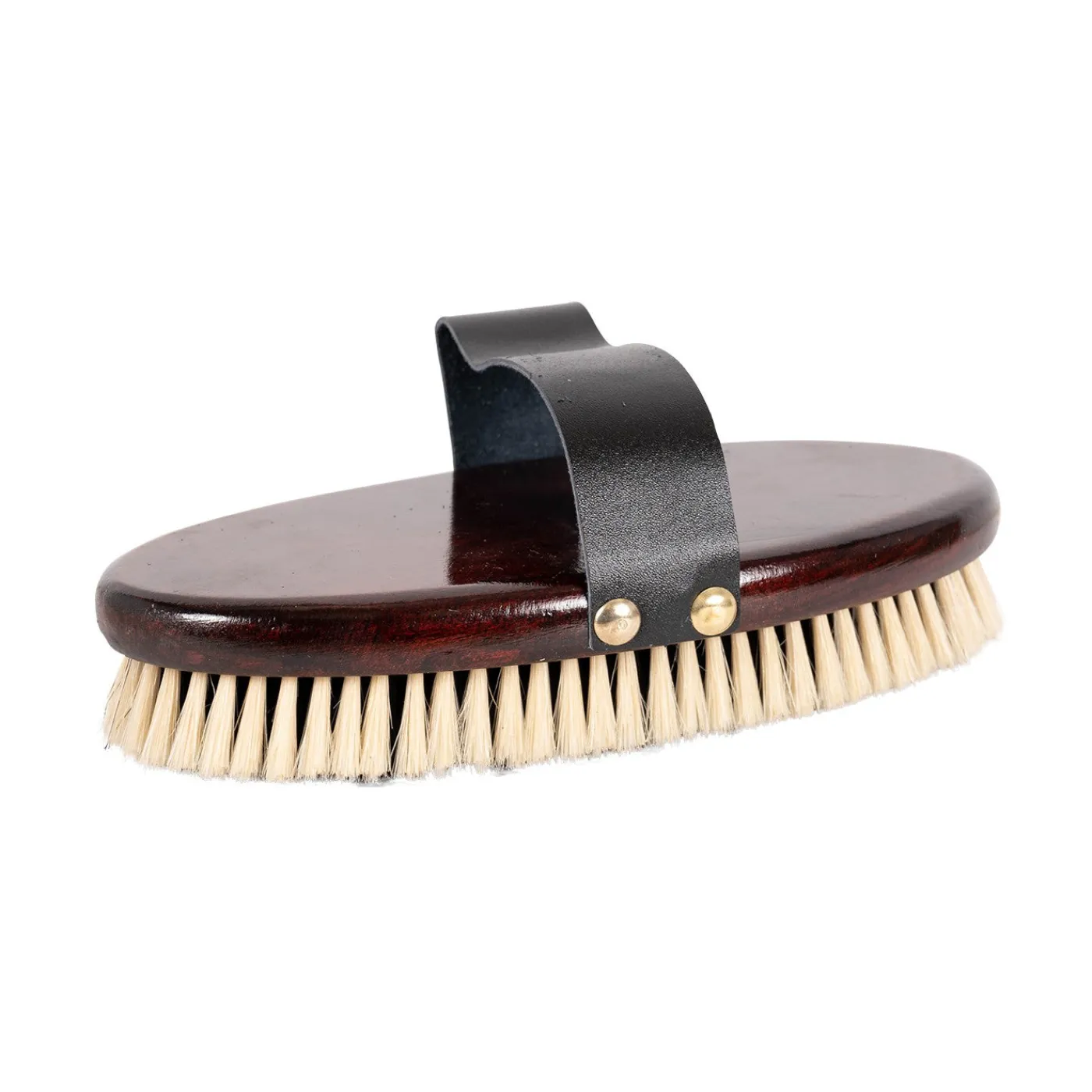 The Supra Deluxe Pig Bristle Body Brush features densely packed, all-natural pig hair bristles embedded into a beautiful wood backing. This brush is complete with a smooth and beautiful gloss finish and a comfortable nylon handle secured with solid brass hardware. The full oval shape and wide handle provides a comfortable and secure fit to the hand.