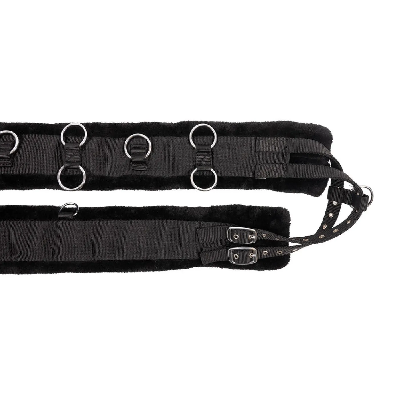 Durable nylon surcingle features a comfortable fleece lining and plenty of adjustability for use on multiple horses. 10 rings offer endless multiple attachment options for endless versatility.