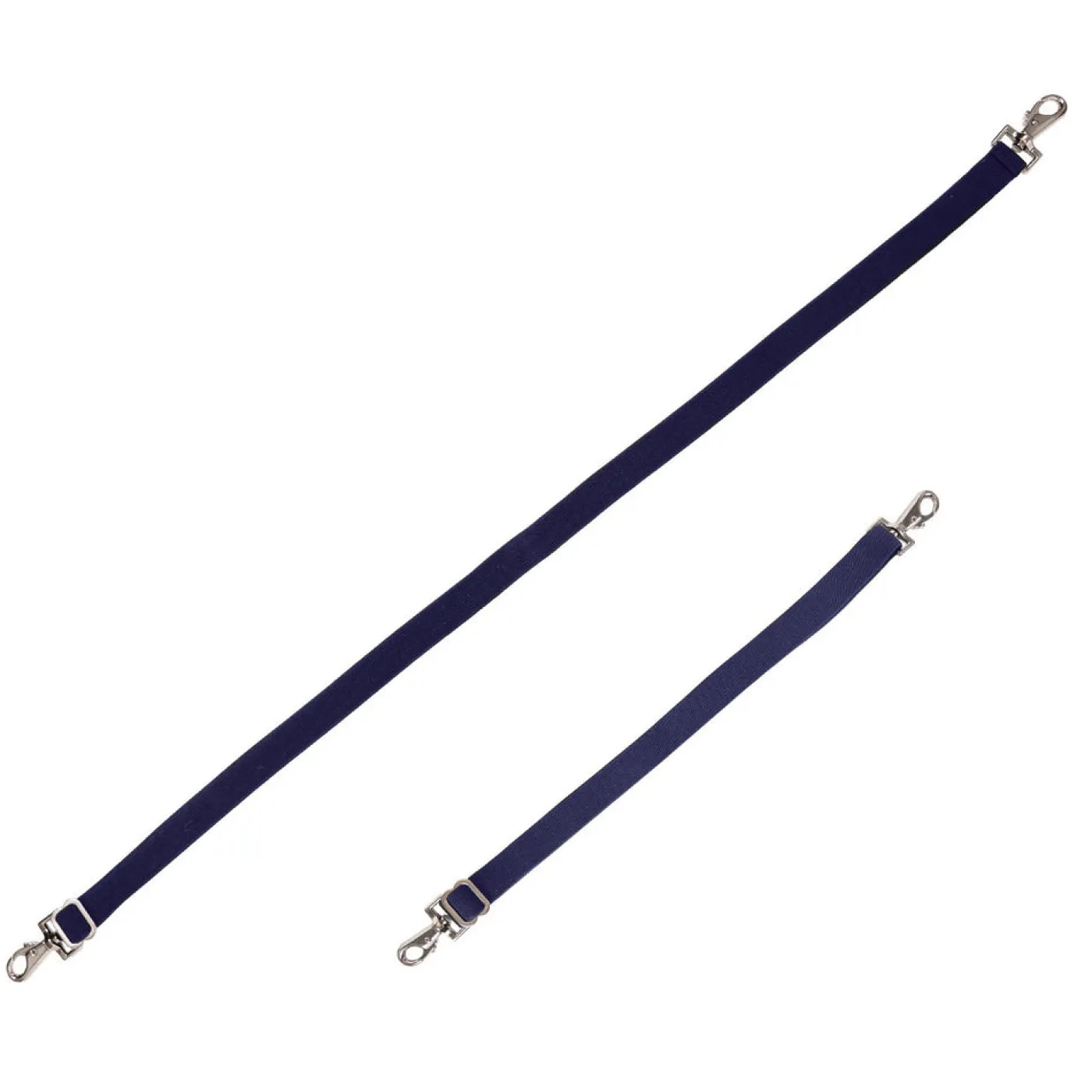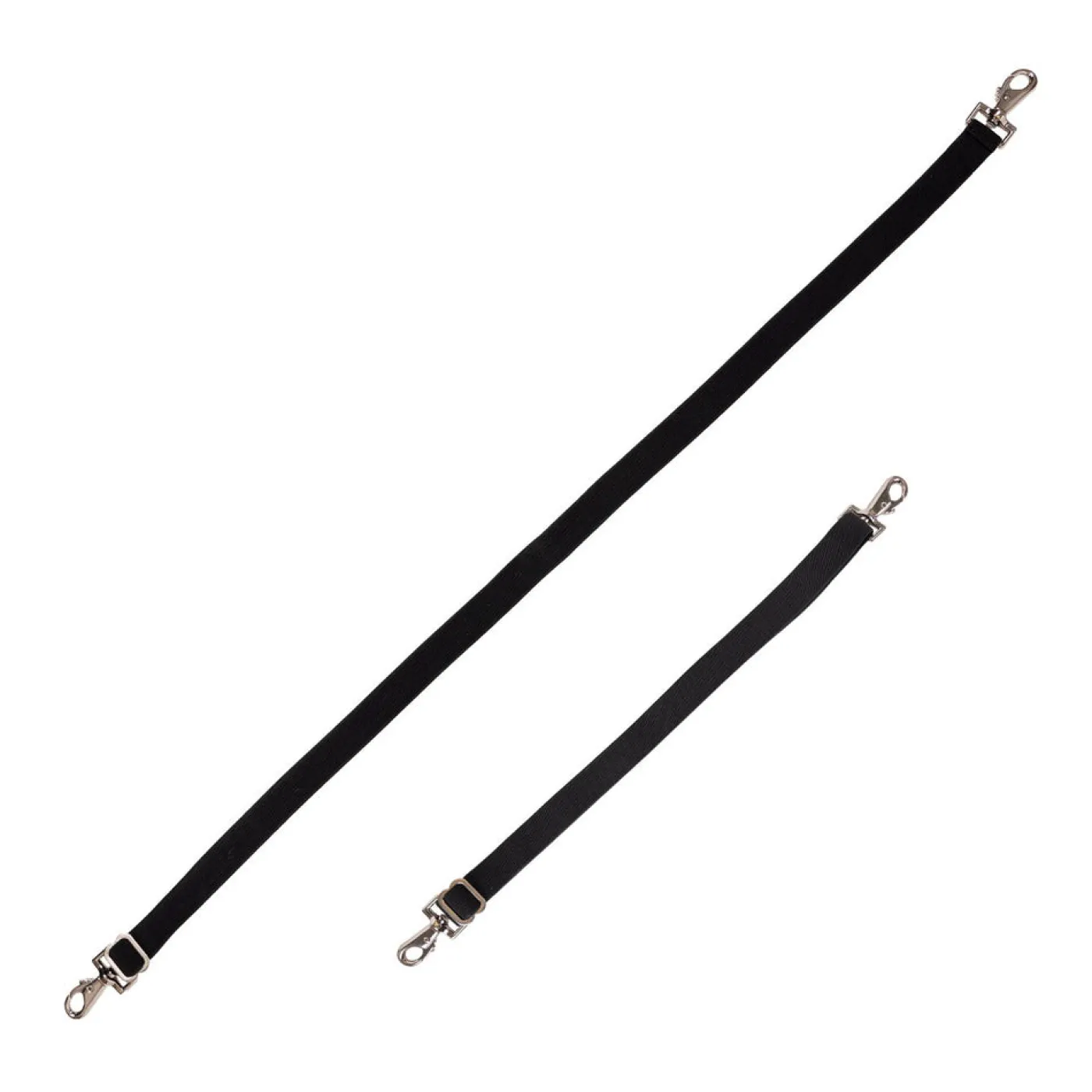 Stretchy, adjustable nylon straps with silver clips on either end attach to D-rings at the back of any blanket. Adds stability to a blanket lacking leg straps, or replace ones that are old or missing. Sold as a pair.