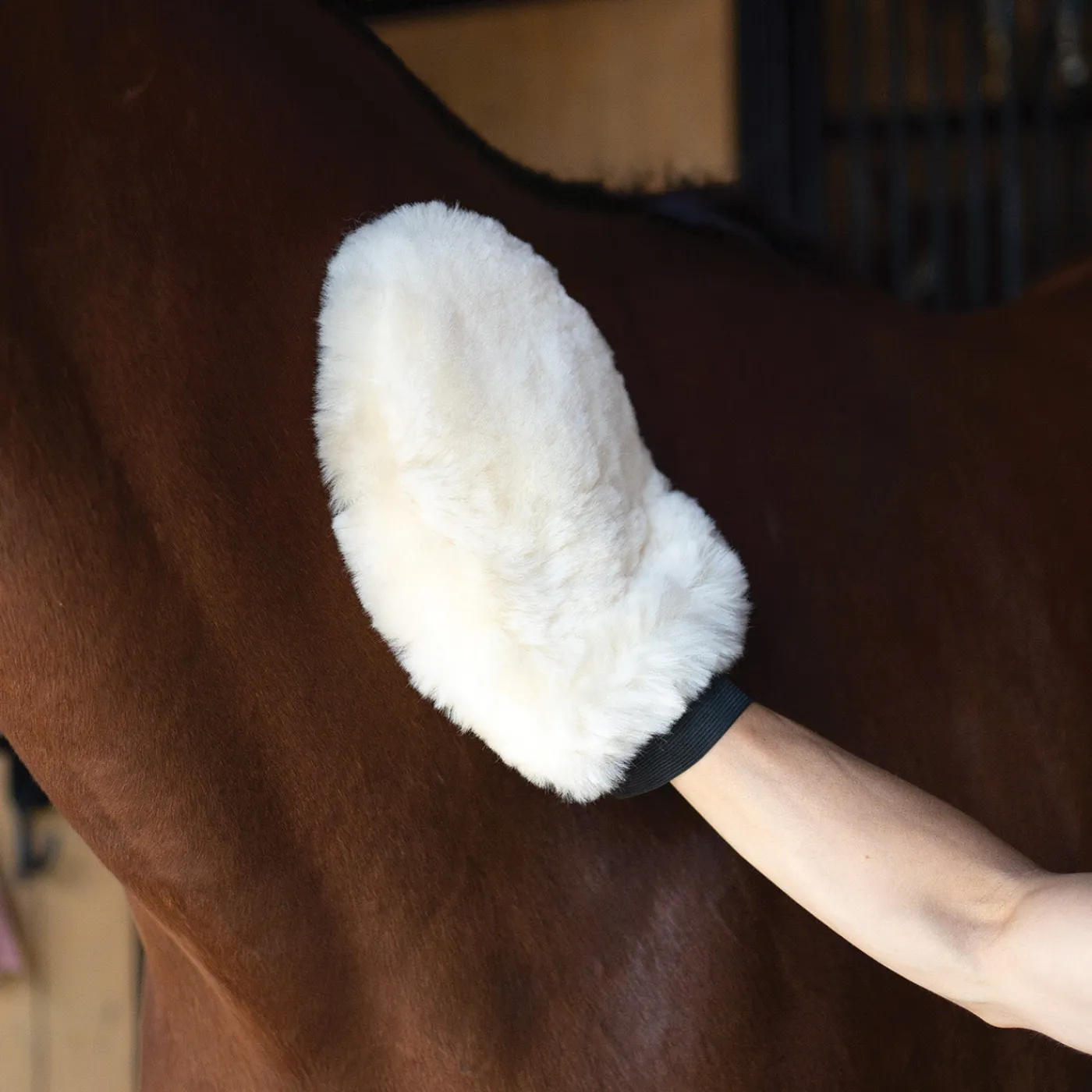 - Massages product into horse’s coat