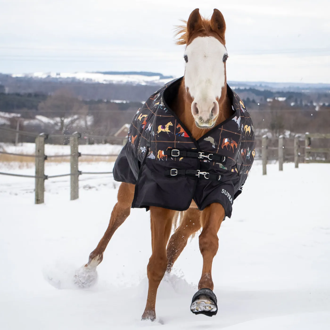 The Supra Turnout helps to keep your horse warm and comfortable during cooler weather. Features a waterproof 600 denier outer shell with a breathable 210 denier nylon lining that helps polish the coat with 300 grams of poly fill for added warmth. The shoulder gussets on each side provide an enhanced fit with no back seam. Complete with double front buckles and cross-biased surcingles help keep the blanket in place, adjustable back leg straps and reinforced stitching at all stress points.