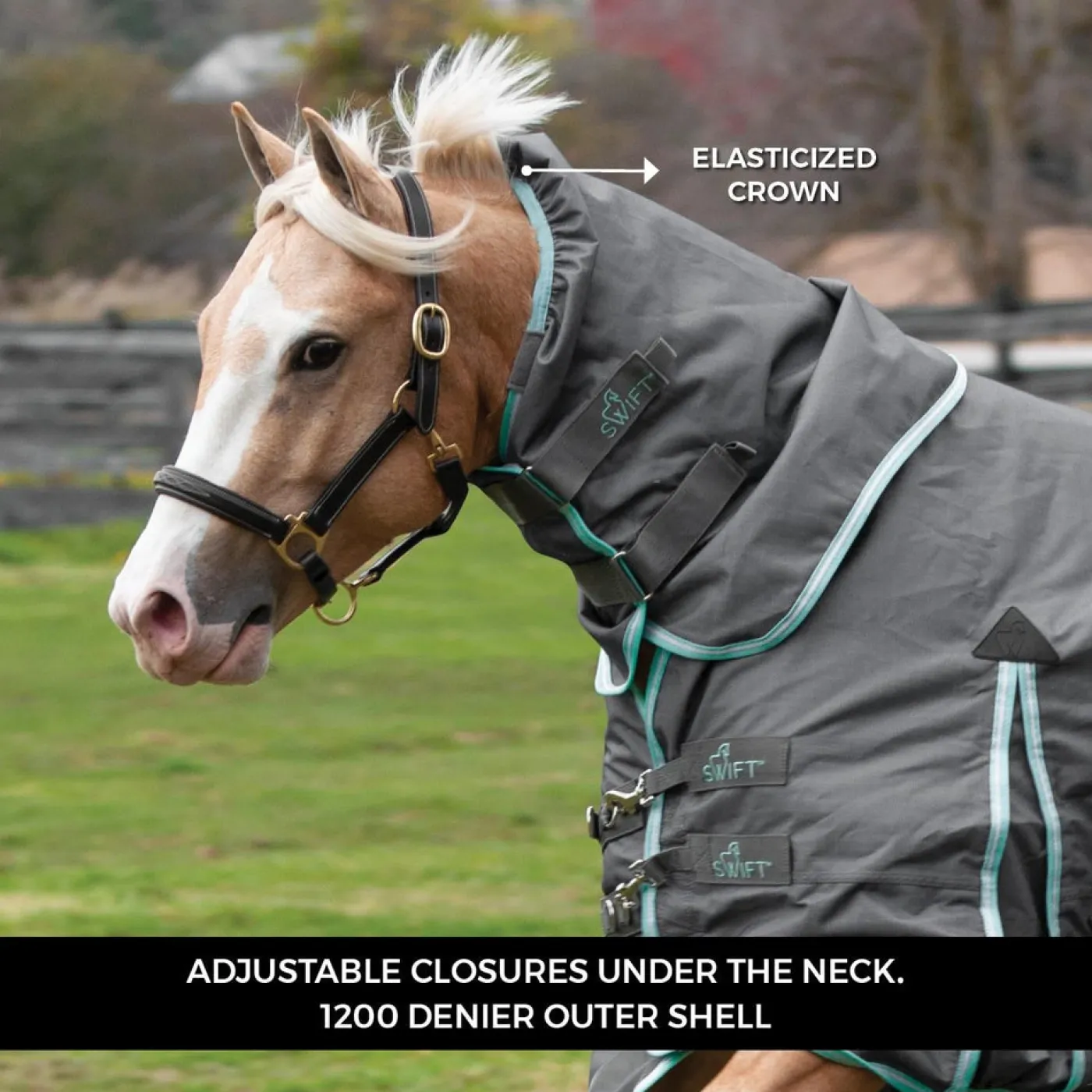 Designed to be compatible with the Swift Pony Performance Wear line, the Swift hood features 0 g of fill and a tough 1200D, Teflon-coated outer shell. 210T antibacterial liner helps keep odour-causing bacteria under control and an elasticized crown enhances fit. Velcro tabs attach hood to turnout or rain sheet and Velcro hook and loop attachments help keep it secure on your pony’s neck.