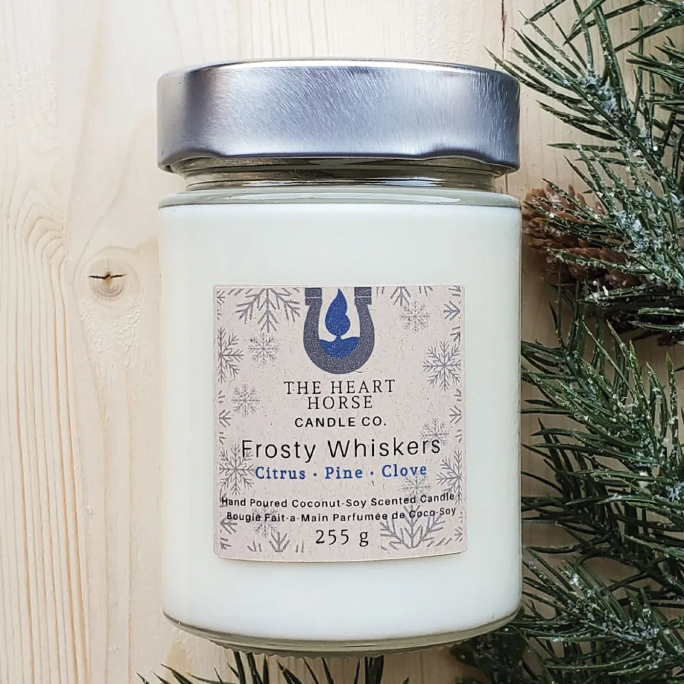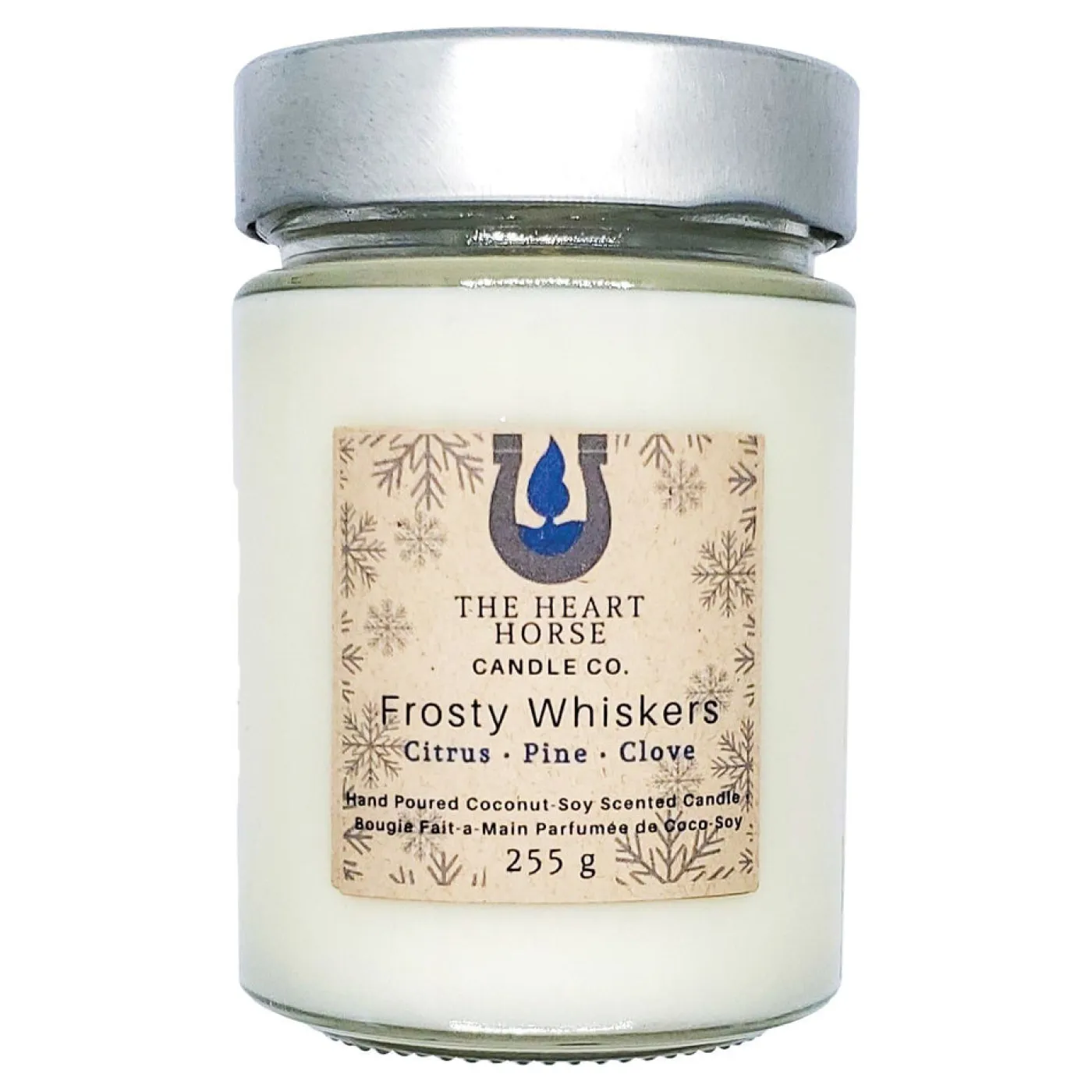 The Heart Horse Candle Co. Frosty Whiskers Candle is inspired by the little icicles that form on our horse’s whiskers in the winter. Offers a warm and fresh scent with notes of citrus, pine, and clove. Handcrafted with high-quality fragrance oils, free of paraffin, phthalates, and dyes. Complete with a 100% cotton wick.