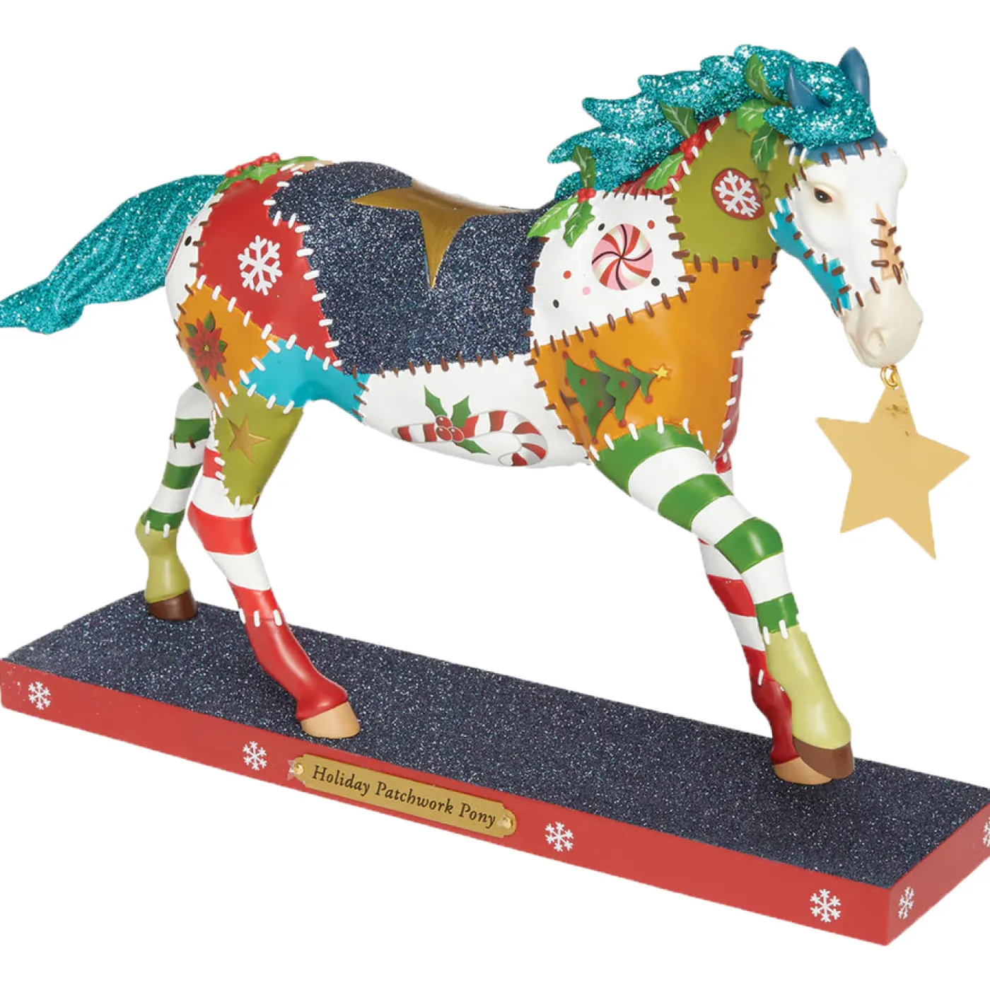This patchwork pony is a marvel of colour and holiday wonder. Patterned in lively and colorful prints, this horse boasts red, green, stripes, sparkles, snowflakes, and candy canes! Along with plenty of blue glitter, stars, and holly.