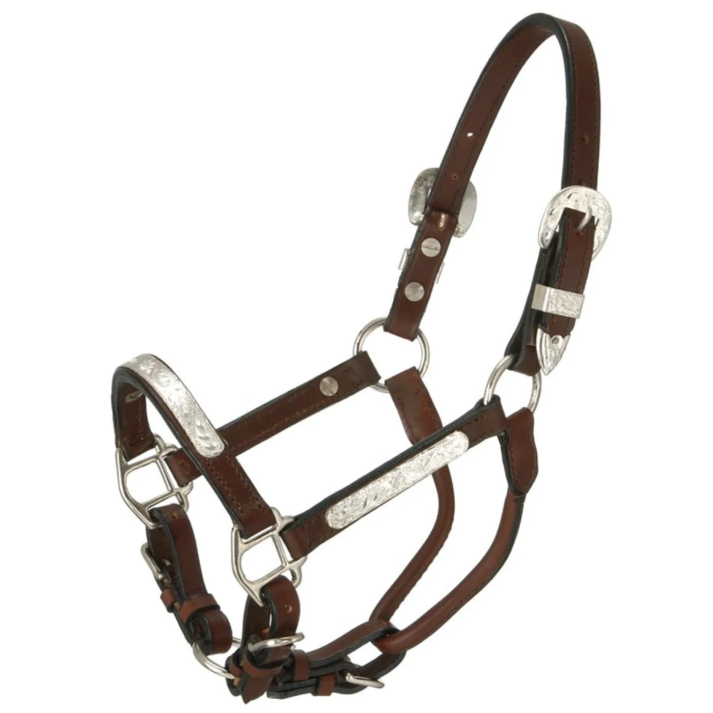 Royal King’s Silver Bar Show Halter is perfect for adding style to your ringside attire and features hand engraved silver trim, buckles, tips and plates on the cheek pieces and noseband. Complete with double stitched edges for added durability. Includes matching leather lead with chain.