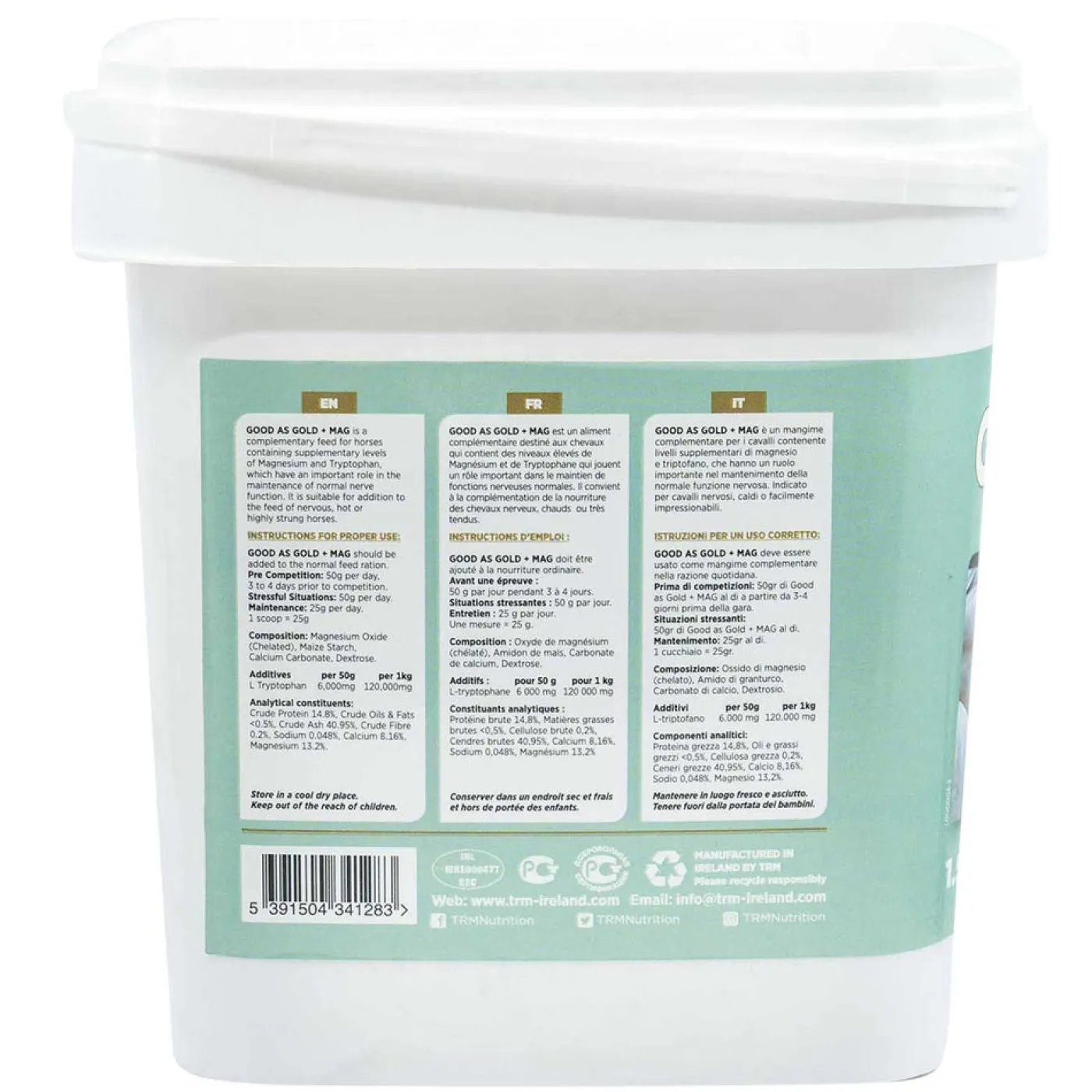 Good As Gold + Mag is a complementary supplement for horses containing supplementary levels of Magnesium and Tryptophan, which can play an important role in normal nerve function. It can help support normal behavior during stressful situations such as change in daily routine, change of environment, during transport, veterinary/clipping procedures and competition. 1.5 kg