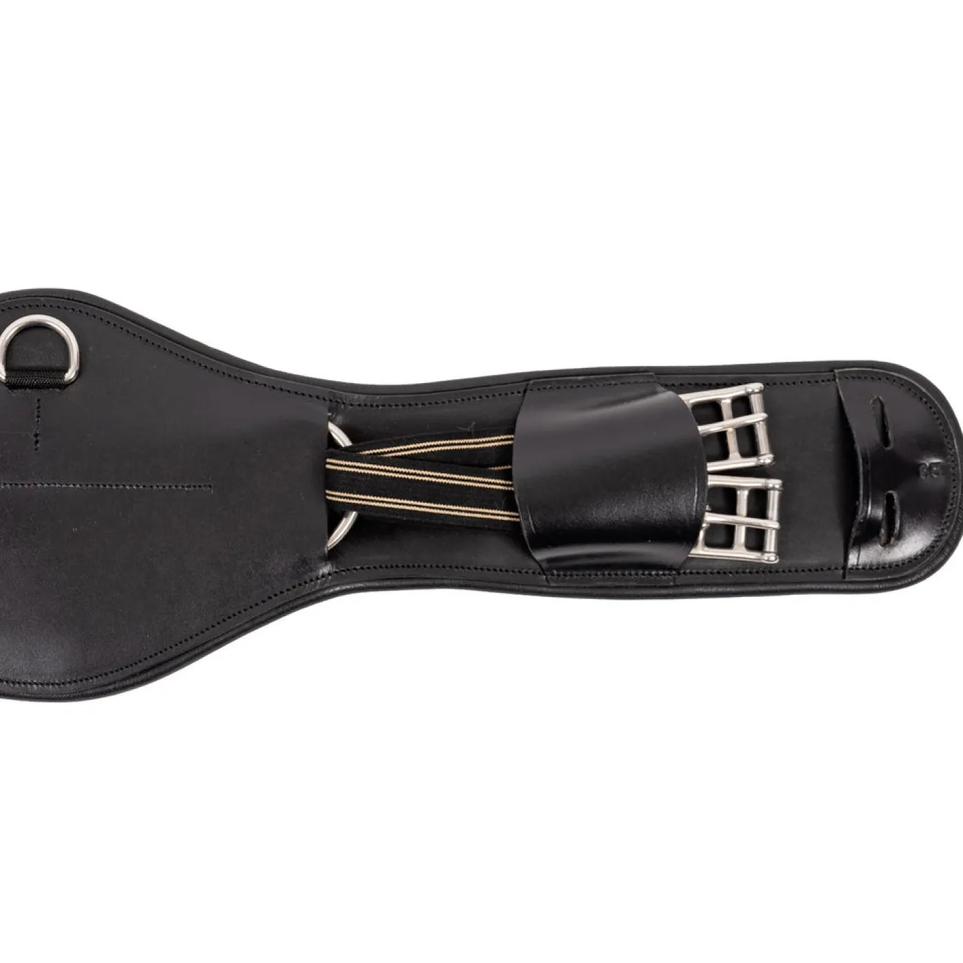 The Mondega Equalizer Short Girth is padded and anatomically shaped for comfort and features elastic ends and a d-ring for training attachments. Suitable for use with dressage saddles or monoflap eventing saddles.