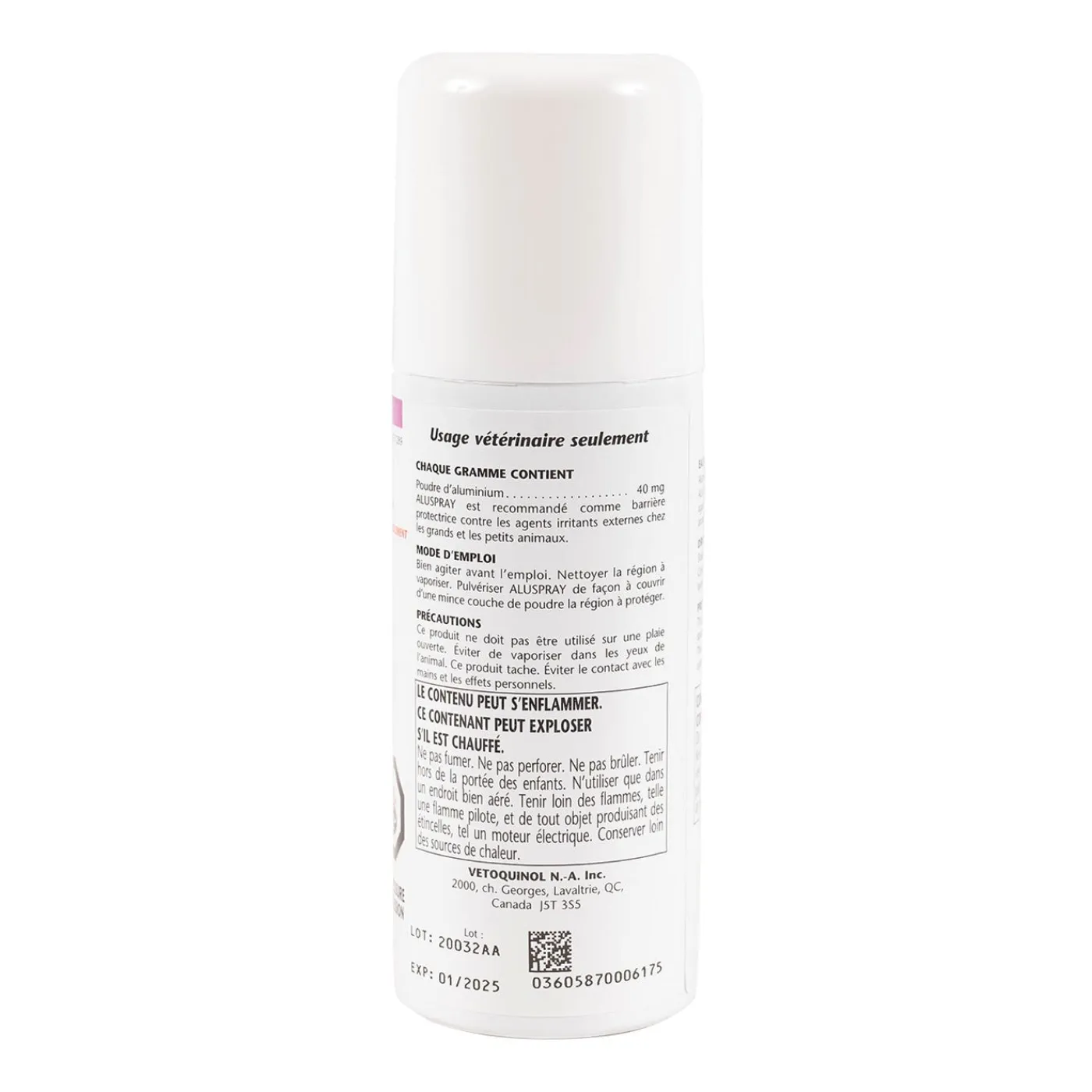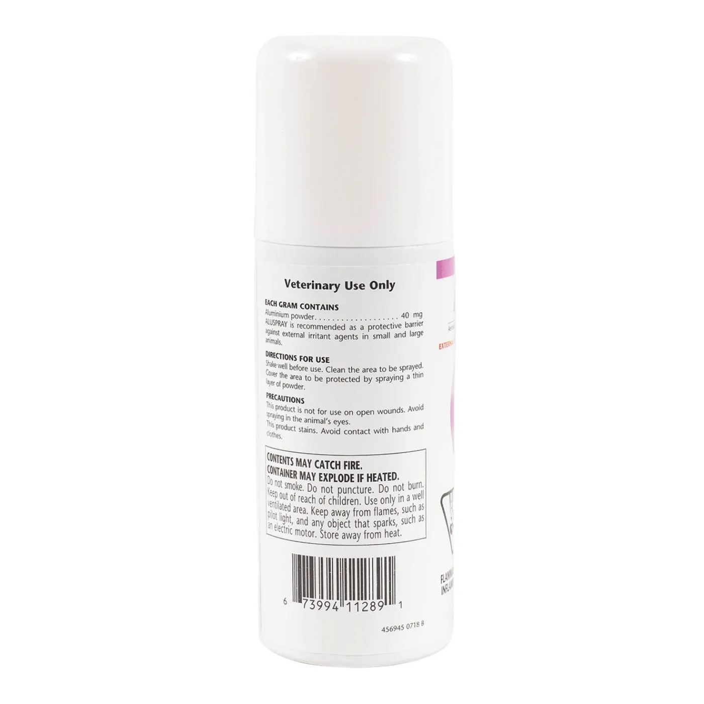 Aluspray permits a fine mist of aluminum to be produced permitting complete covering of lesions. This film protects against dirt and insects. Aluspray allows the wound to breathe, will not wash off with water – but is easily removed soap. Aluspray is permitted under FEI and HRA regulations. Recommended as a protective barrier against external irritant agents in small and large animals. To use, clean the area to be sprayed and cover by spraying a thing layer of powder. Note that this product is not for use on open wounds. Avoid spraying in animal’s eyes. This product stains; avoid contact with hands and clothes.