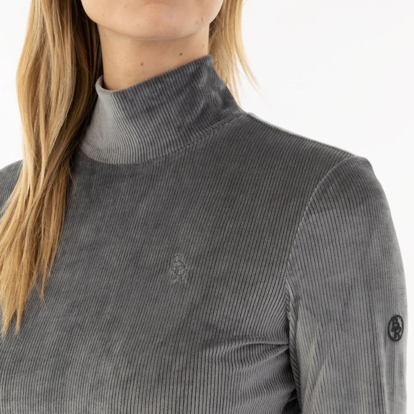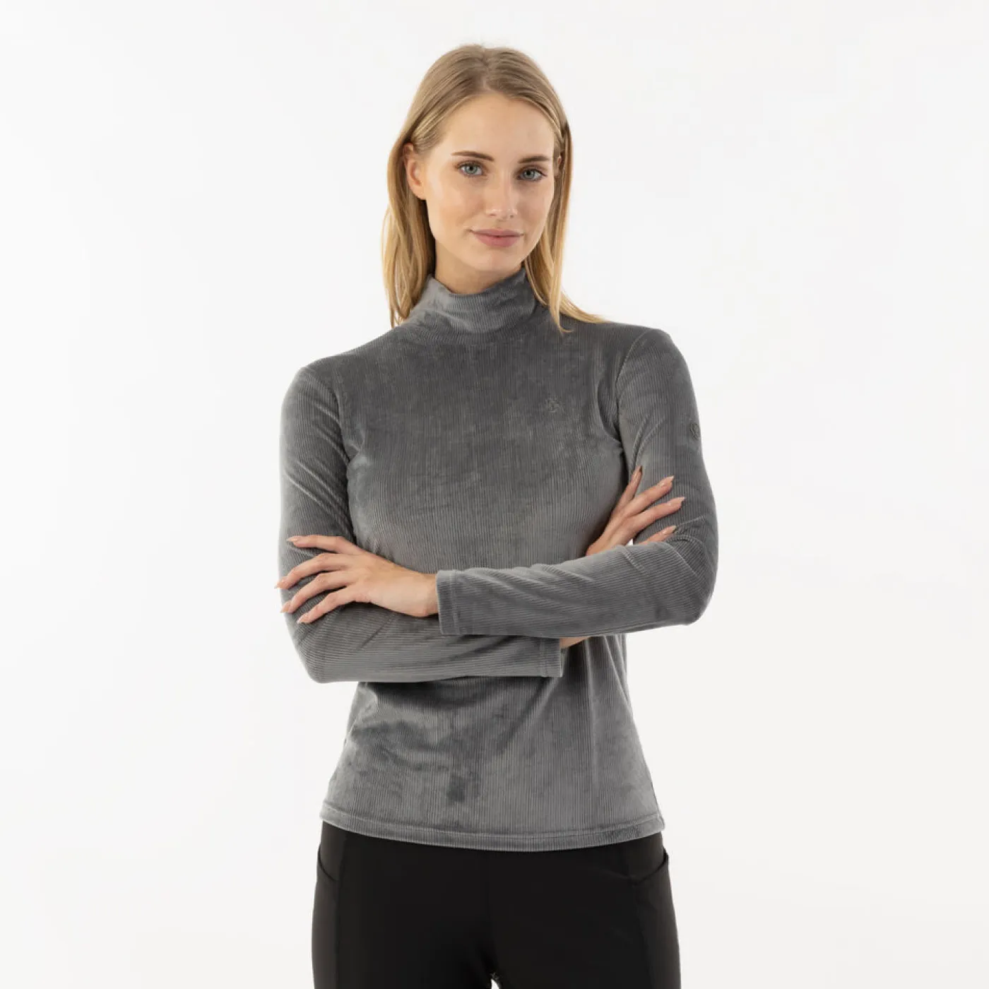 The BR Fayah Top offers an elegantly ribbed velvet pullover with a tailored fit. Created from moisture wicking fabric to provide comfort while riding. Complete with a silver print at the back shoulder.