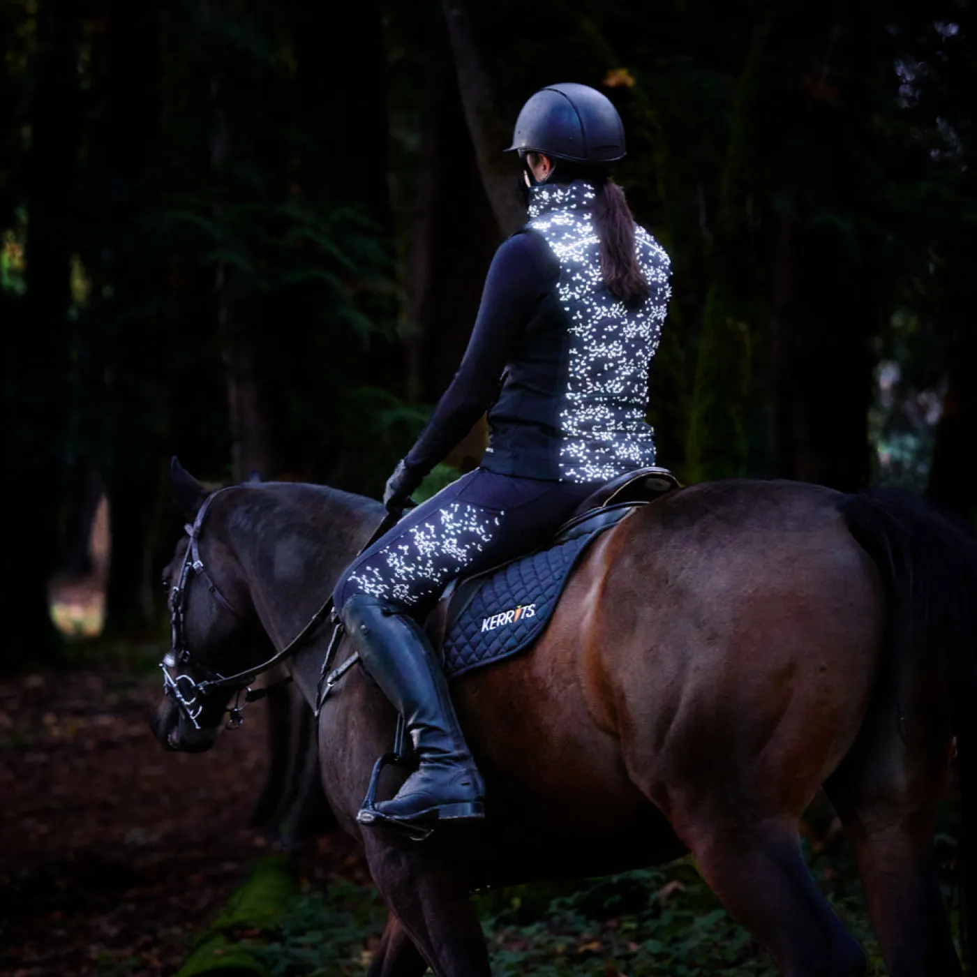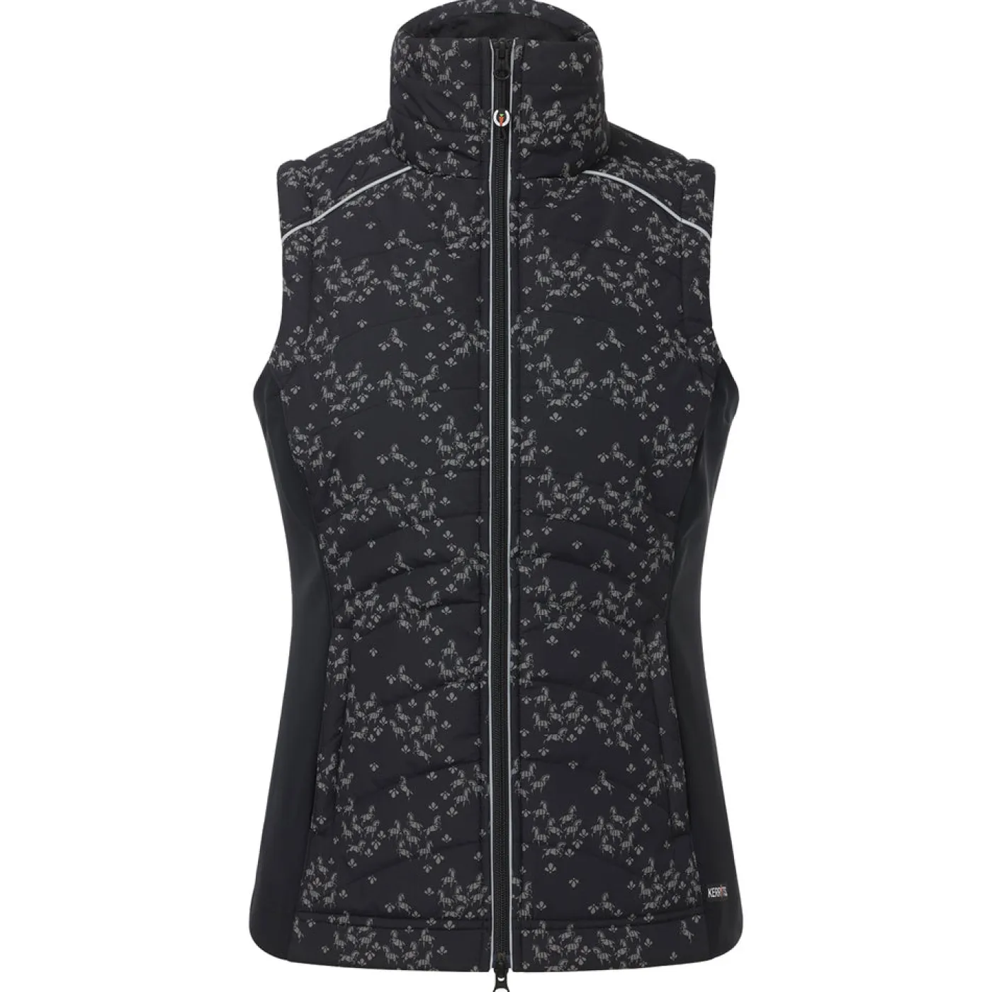 Enjoy the ride with this fun yet practical riding vest, featuring Kerrits exclusive “Happy Herds” horse print, a soft grey tone by day, the mini horses and piping come to life with light reflection for high visibility at dawn or dusk. Insulated with mid-weight poly-loft fill, the quilted core effectively regulates warmth, while stretchy knit side panels ensure ease of movement. A tall, plush-lined collar helps keep you cozy, and the two-way front zipper allows for ventilation when needed. With a wind and water-repellent exterior, this hip length vest is also ideal for layering.