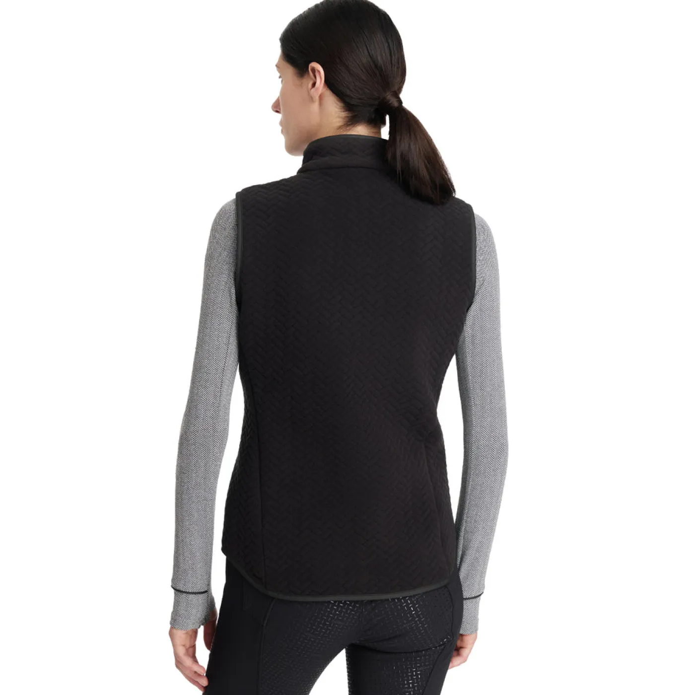 This staple fleece vest boasts an elevated look with a heat-welded quilted herringbone design. Featuring a matte-finish edge binding and a curved hem that brings a technical feel to this layering piece, and is ideal for wearing in the saddle. A two-way zip offers you different wear options, and a LeMieux branded rubber and metal badge matches the LeMieux Aspen Collection.