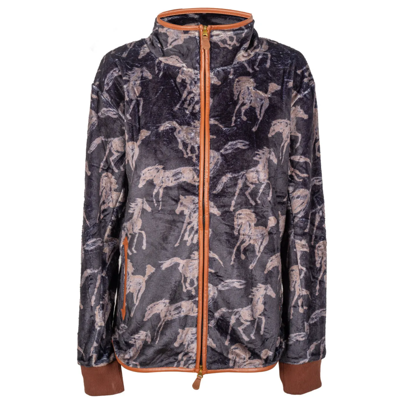 Soft, fur-textured fleece featuring an all-over horse print. The long cozy cut of this jacket will keep you warm and comfortable no mater how early your show schedule gets you up. Two way zipper lets you hop on your horse without losing that body heat. Soft faux leather trim dresses up this already stylish piece.