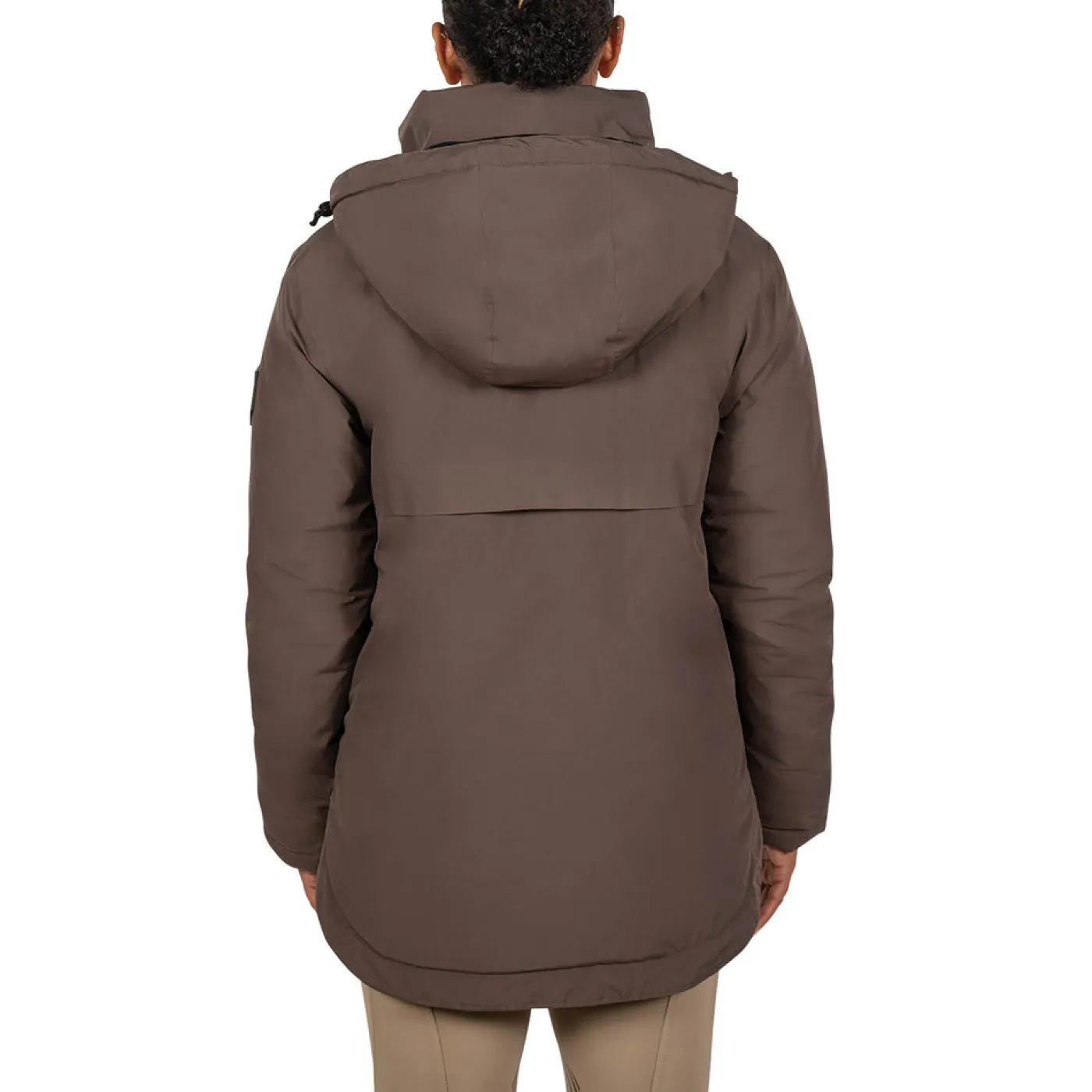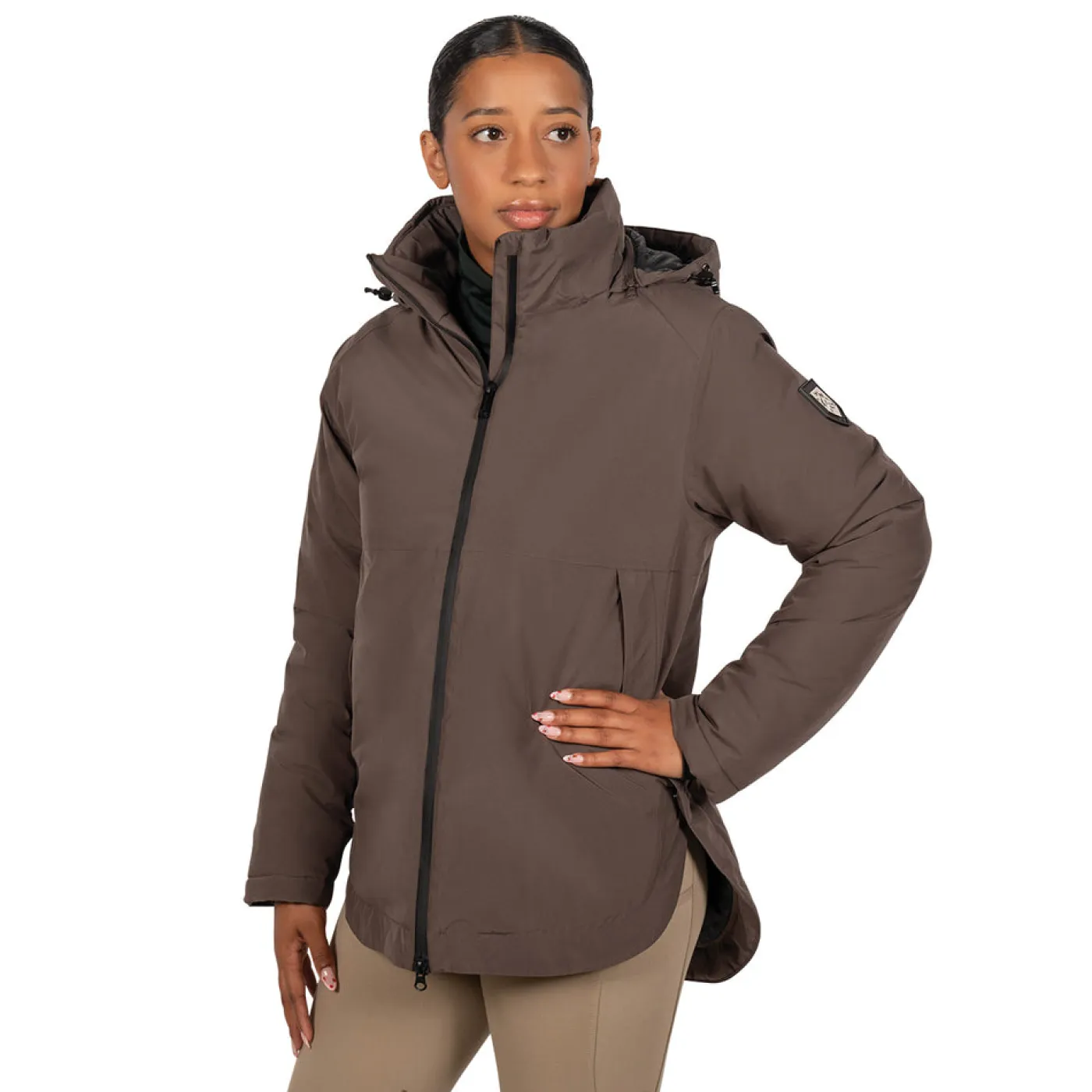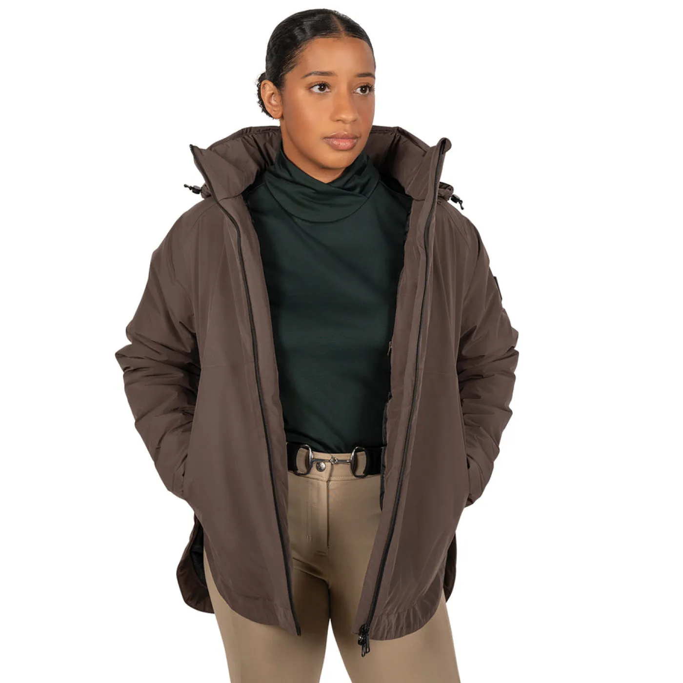 Suitable for winter riding wear with a waterproof and windproof construction. Lined and breathable with a high collar and detachable, adjustable hood for added coverage. Features a 2-way front zip, 2 concealed front zippered pockets and 1 interior pocket. Complete with a longer cut at the back.