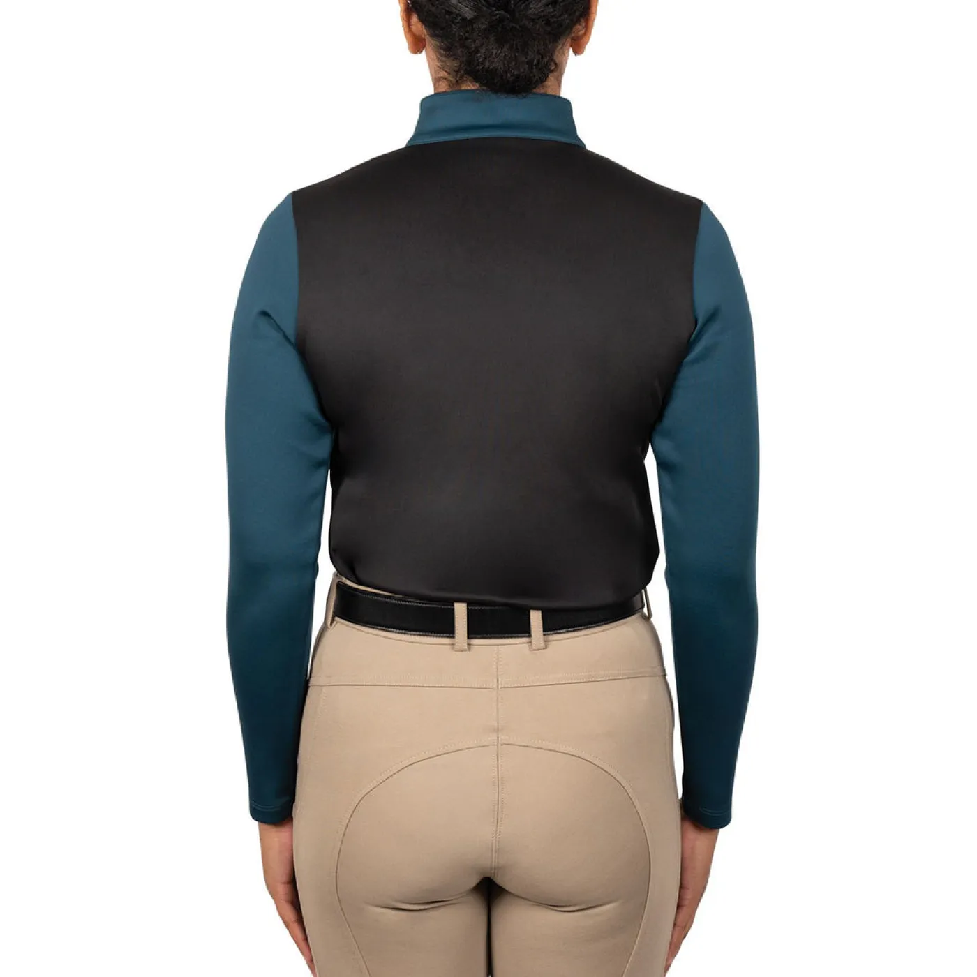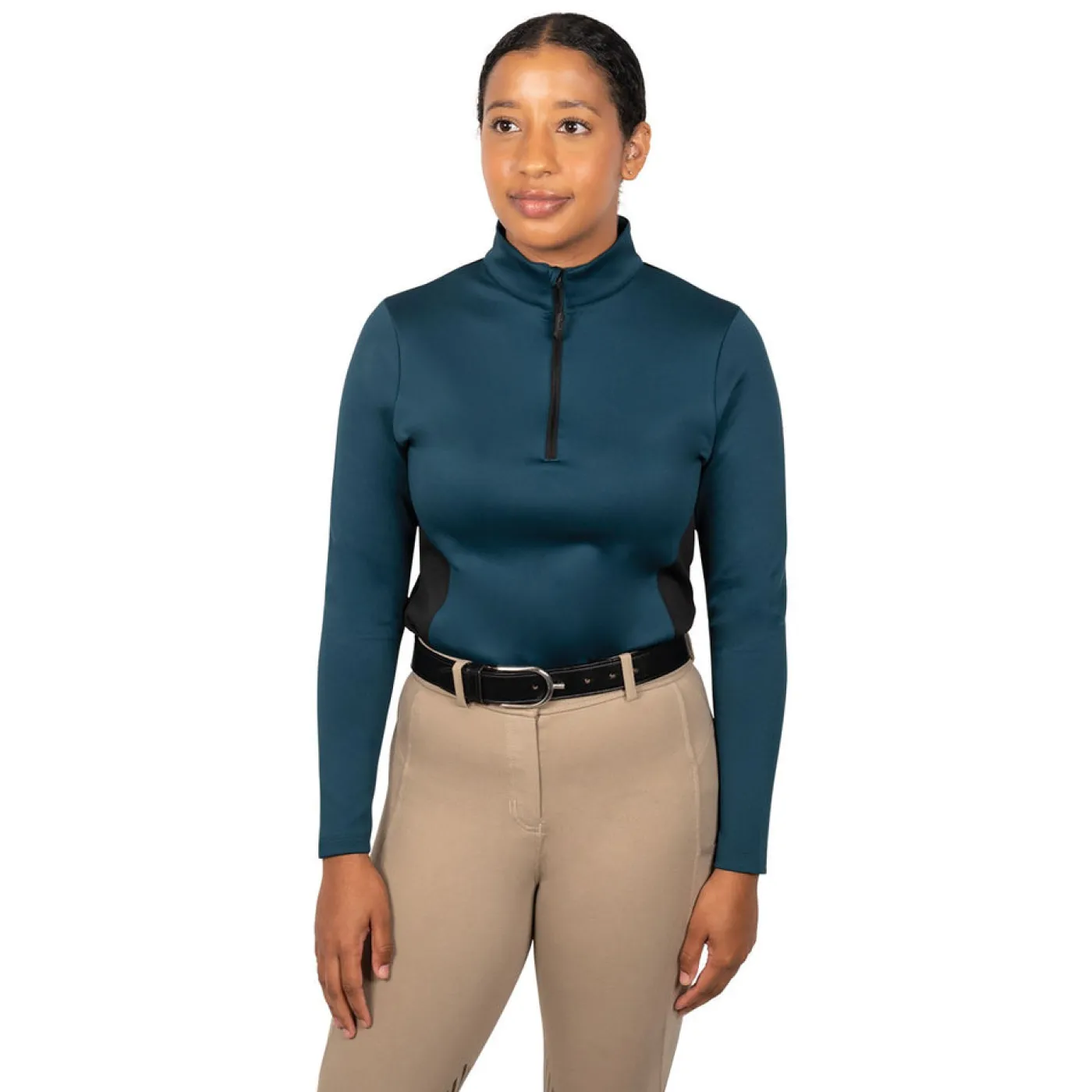 The TemTeq Equestrian Adira Top offers a breathable, 1/4 zip training shirt for in the saddle. Constructed from comfortable 4-way stretch material that is sweat absorbent and offers shape retention with the inclusion of spandex. Complete with a colour blocked back and waist defining contours at the side.