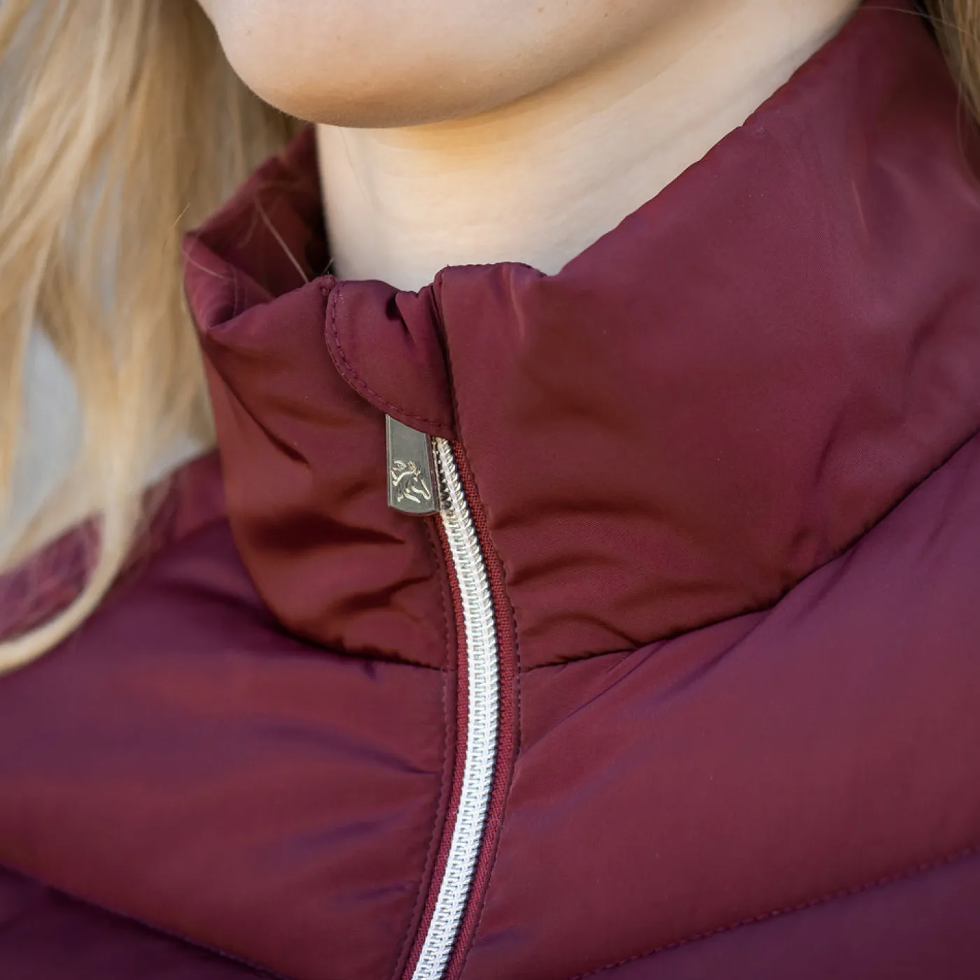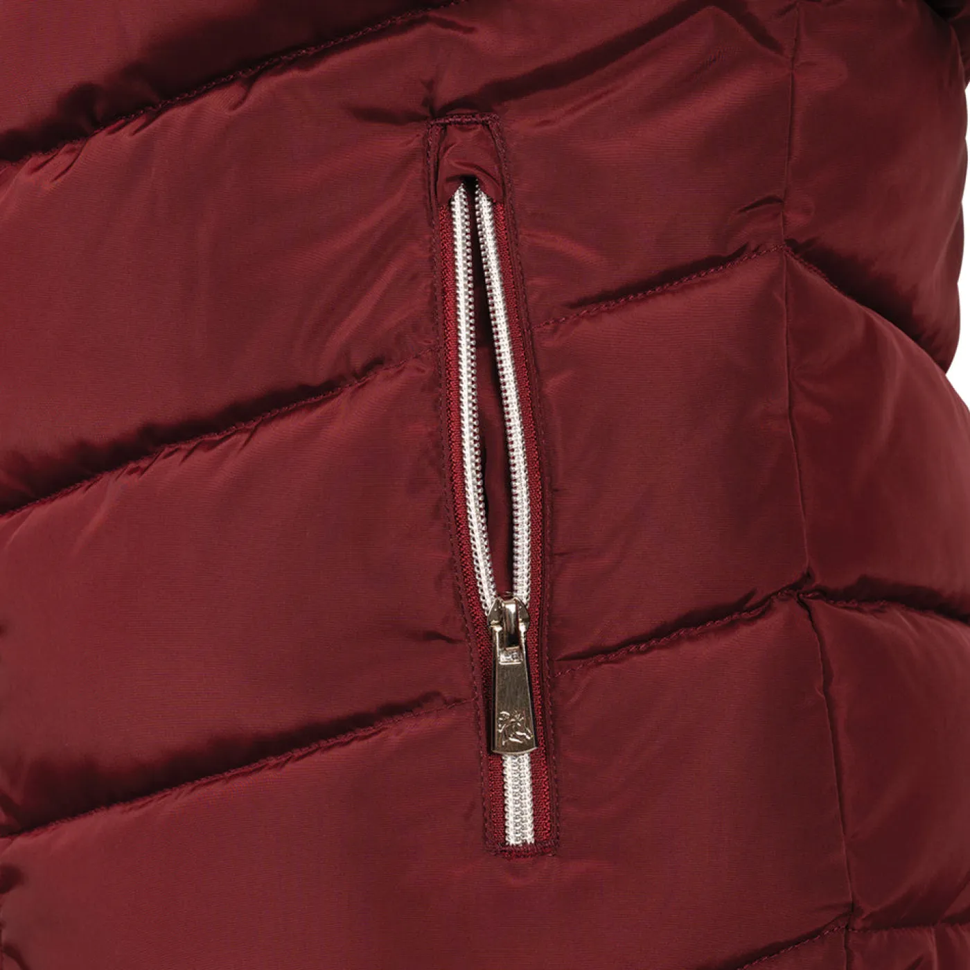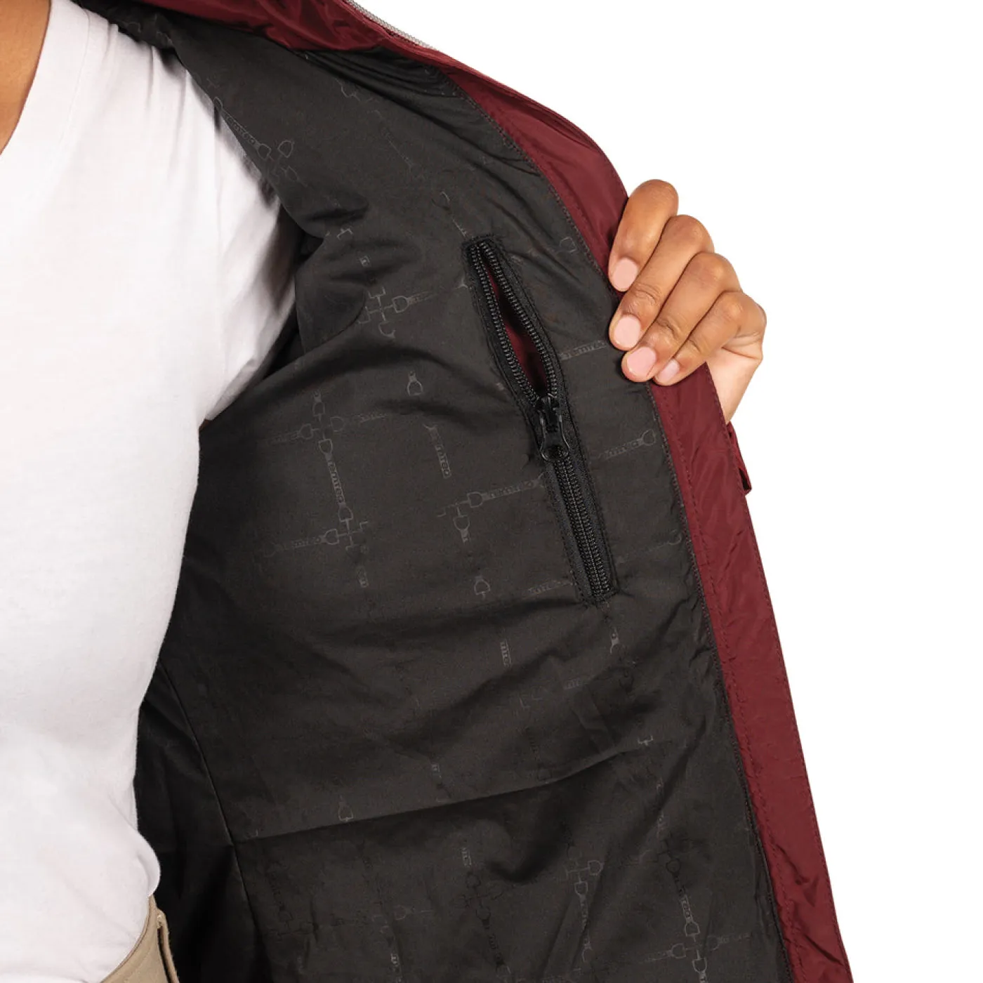 The TemTeq Equestrian Capilano Jacket offers a great top layer during cold weather riding. Features a stand collar with a 2-way zippered front and two front zippered pockets. Offers stretch comfort storm cuffs to help keep the wind out. Lined with a cabernet TemTeq logo lining, and an attractive V-shaped outer quilted design.