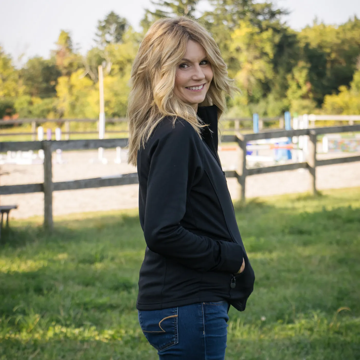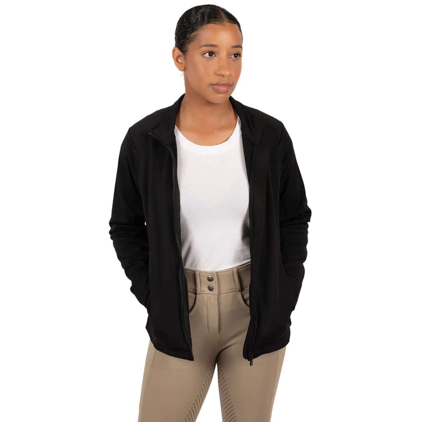 The TemTeq Equestrian Functional Tech Jacket offers a great piece for early fall weather to layer as a jacket over a base layer, or for winter under a vest or heavier jacket. Made from a stretchy technical fabric that allows you to move with ease with seam detailing offering a flattering fit. Complete with a full zip front with neck guard, and zippered pockets for all your necessities.