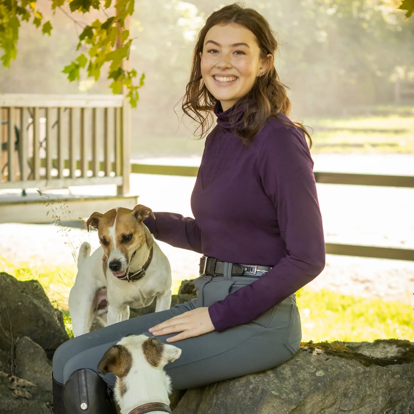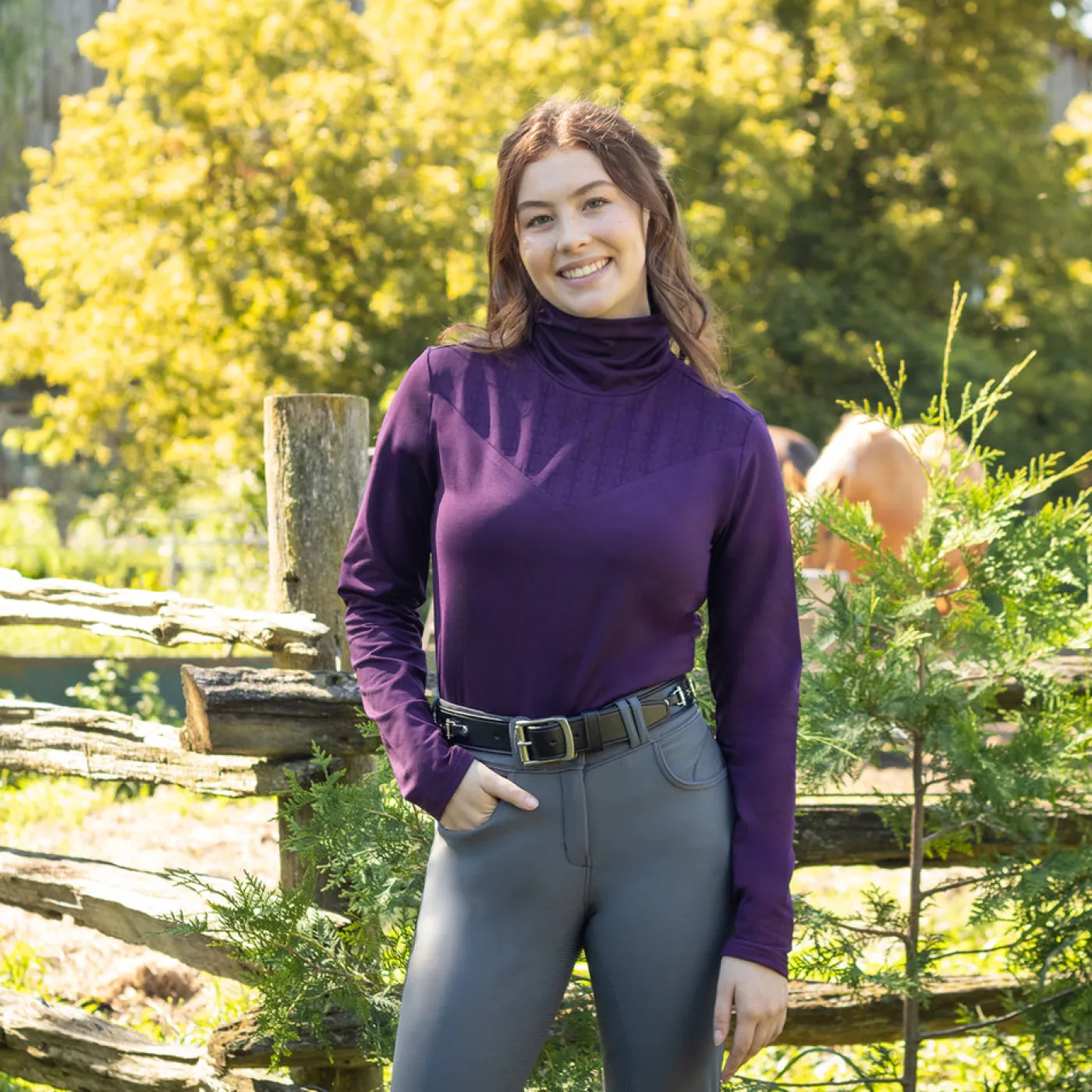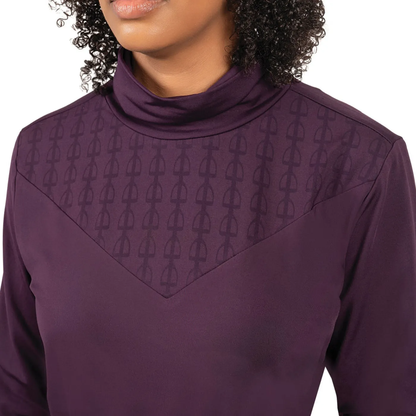 The TemTeq Equestrian Juniper Turtleneck Top is the perfect layering piece as the weather gets colder. Made from moisture-wicking fabric to help keep you dry and warm. Features a fleece backed lining with a subtle tone-on-tone equestrian motif print at the neck.